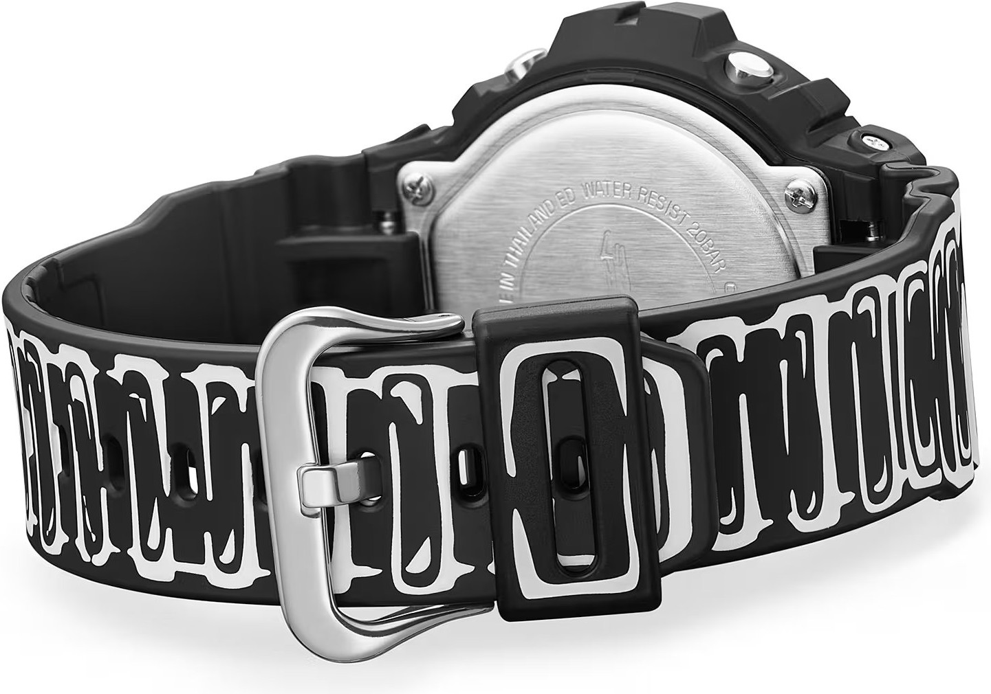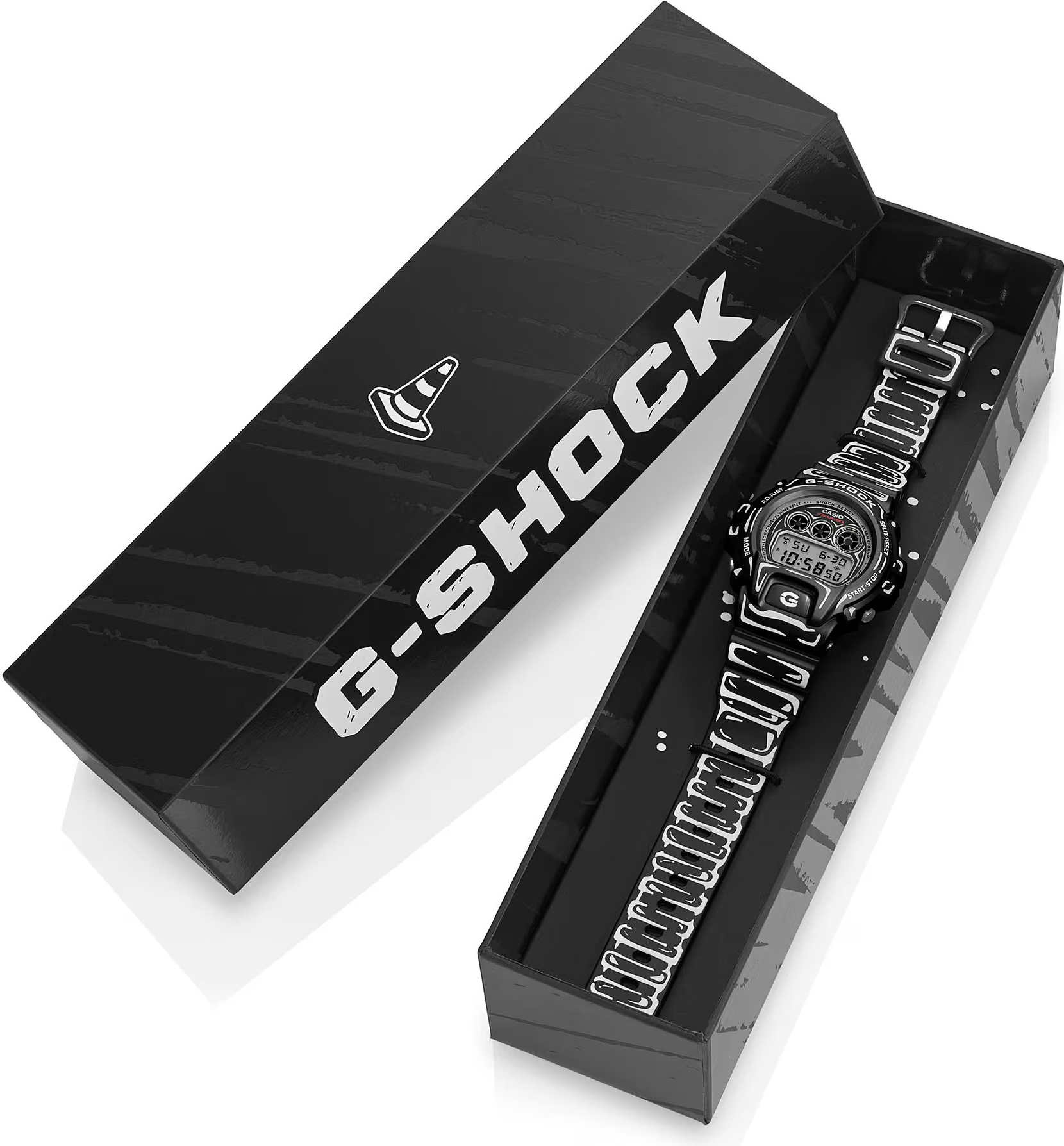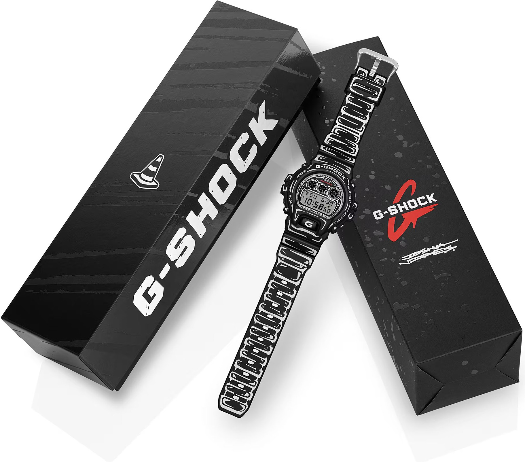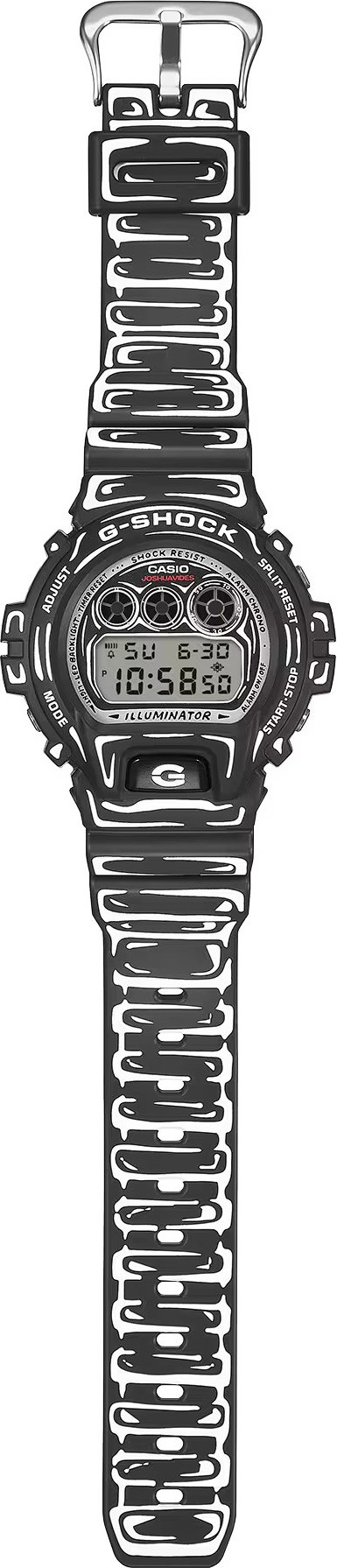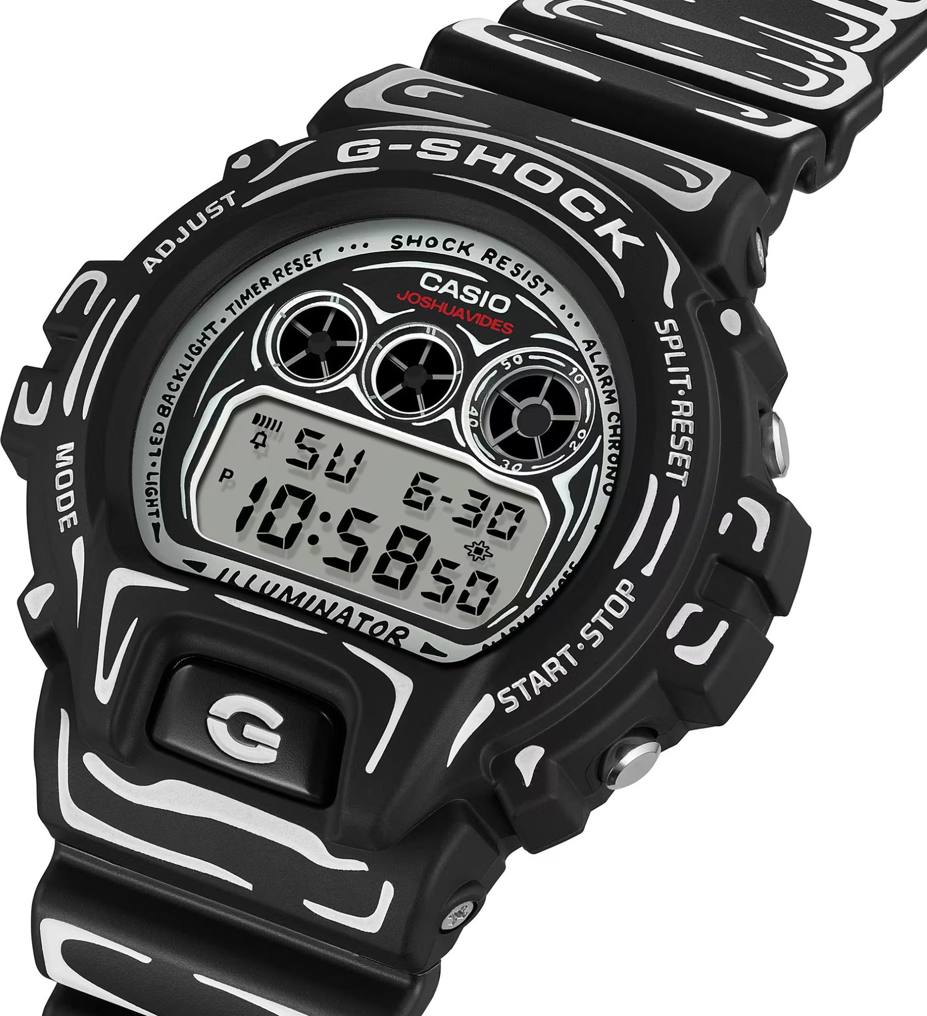 Casio G-SHOCK DW-6900JV-1ER je speciální limitovaná edice vzniklá ve spolupráci s umělcem Joshua Vides, který je známý černobílou, ručně kreslenou estetikou inspirovanou komiksem. Na tomto modelu se jeho grafika promítá do celého vzhledu - od číselníku přes lunetu až po řemínek. Základ tvoří matně černé provedení doplněné bílými „kreslenými“ linkami, díky nimž hodinky vypadají jako 2D ilustrace na zápěstí. Nechybí ani detailní prvek po rozsvícení ...