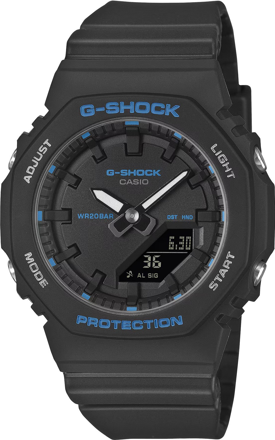 Casio G-SHOCK GMA-P2100BA-1AER je kompaktní analogově-digitální model s typickým osmiúhelníkovým tvarem řady 2100. Minimalisticky černé provedení doplňují modré akcenty, které dodají sportovnímu designu lehce hravý, moderní výraz. Hodinky působí čistě a univerzálně - skvěle zapadnou do městského stylu, ale zároveň si nechávají drsnou identitu G-SHOCK pro každodenní zátěž.