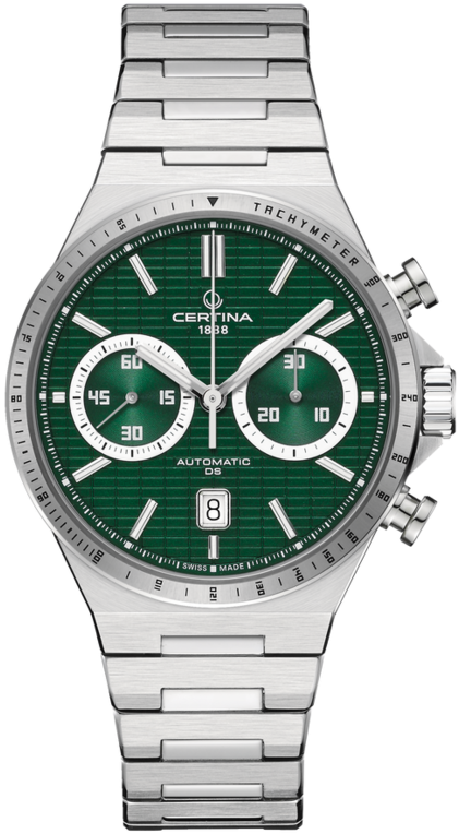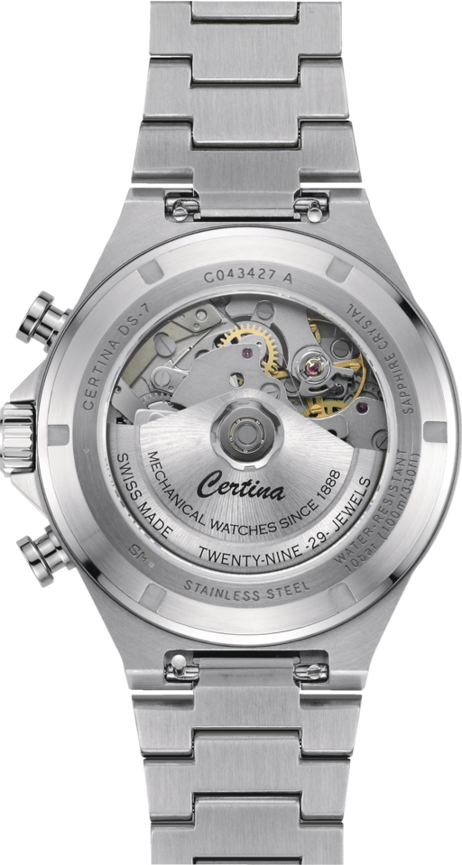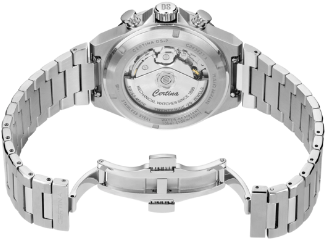 Certina DS-7 Chrono Auto C043.427.11.091.00 přináší sportovní vzhled zápěstí a může přivést zpět vzpomínky pro znalce historických hodinek. Design nové produktové řady je odvozen od modelu ze 70. let, ale získal rozhodně moderní vzhled – s dynamickými liniemi, módními detaily a optimální odolností.