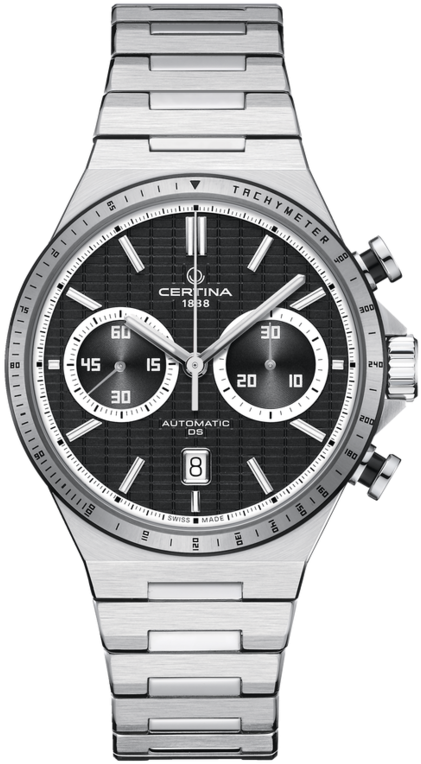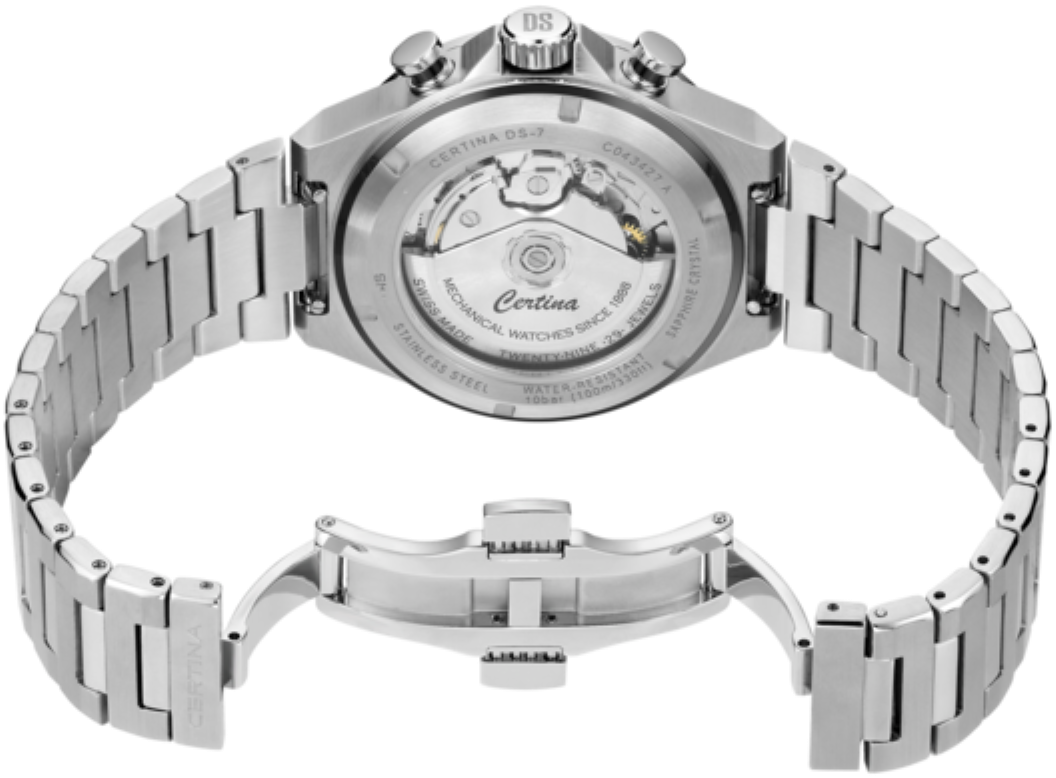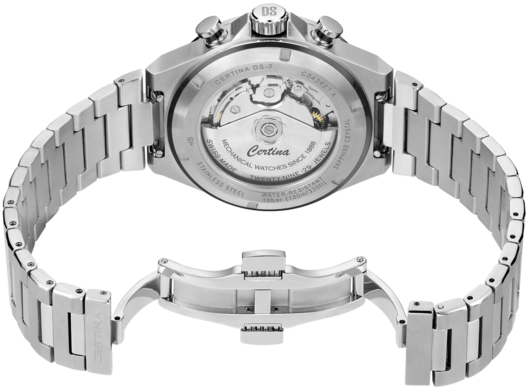 Certina DS-7 Chrono Auto C043.427.21.051.00 přináší sportovní vzhled zápěstí a může přivést zpět vzpomínky pro znalce historických hodinek. Design nové produktové řady je odvozen od modelu ze 70. let, ale získal rozhodně moderní vzhled – s dynamickými liniemi, módními detaily a optimální odolností.