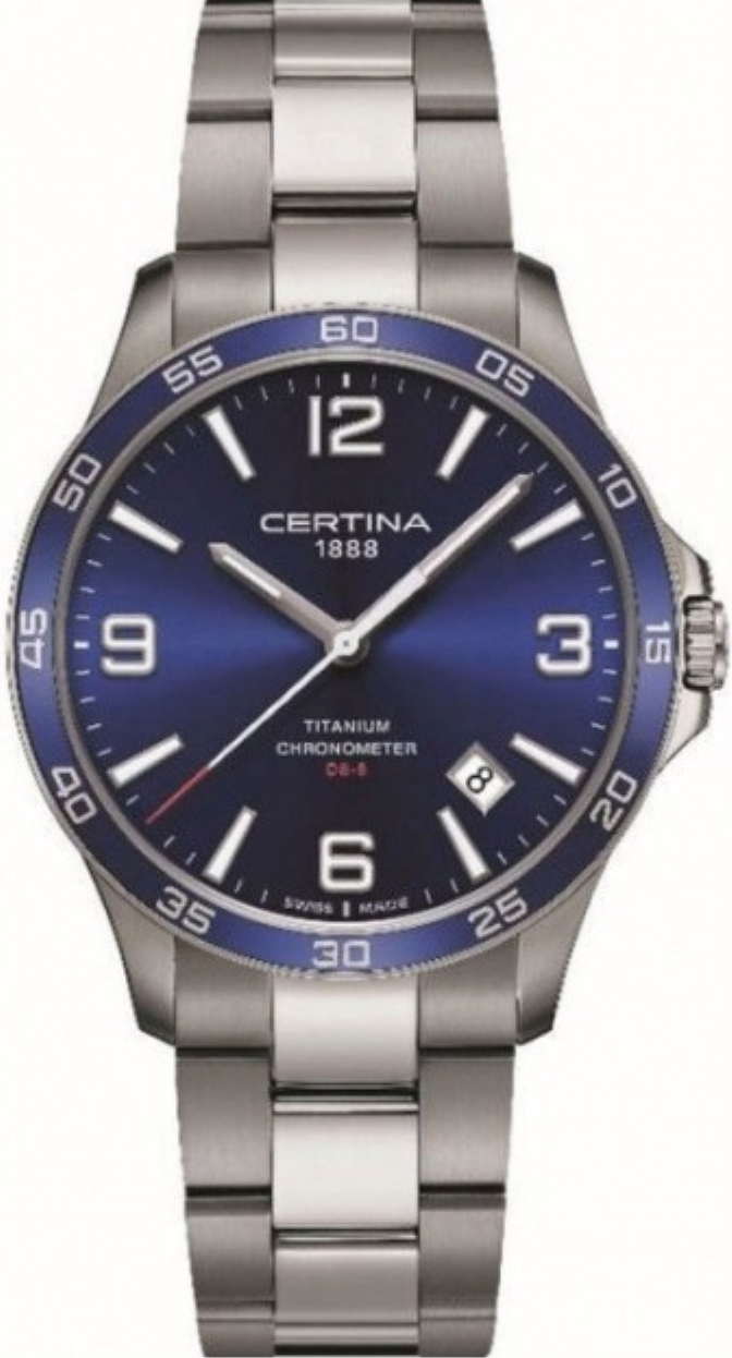 odolnost proti nárazům, abnormální tvrdost - díky tomu nenarušení povrchu ani při velké fyzické zátěži a nádherná čirá čistota, která zůstává po celou životnost sklíčka. Čtení času na hodinkách je poté radost - sklíčko je totiž stále jako nové. Safírová sklíčka se vyrábí v různých podobách a tvarech.Super-LumiNova (SLN) je luminiscenční materiál s vlastnostmi fosforu. Typ BG W9, který Certina používá, vydává ve tmě modravé světlo. Tato svítivost se ve tmě postupně ztrácí, ale na světle se automaticky obnovuje pro naplnění kapacity materiálů pro další noční či večerní svítivost.Přesný a ještě přesnější - to je chronometr. Chronometr jsou hodinky, jejichž přesnost byla oficiálně testována a ověřena nezávislou laboratoří. Tento model byl testován oficiální švýcarskou testovací laboratoří Control Officiel Suisse des Chronometres (COSC) a byl mu udělen certifikát kvalityTitan (titanium) je kovový prvek, který je mimořádně odolný, 100% hypoalergenní a antikorozivý. Jeho další předností je neobyčejná lehkost - je přibližně o polovinu lehčí než ušlechtilá nerez ocel. Tento materiál má v matném provedení elegantní šedou barvu, v lesku je čistě stříbrný.