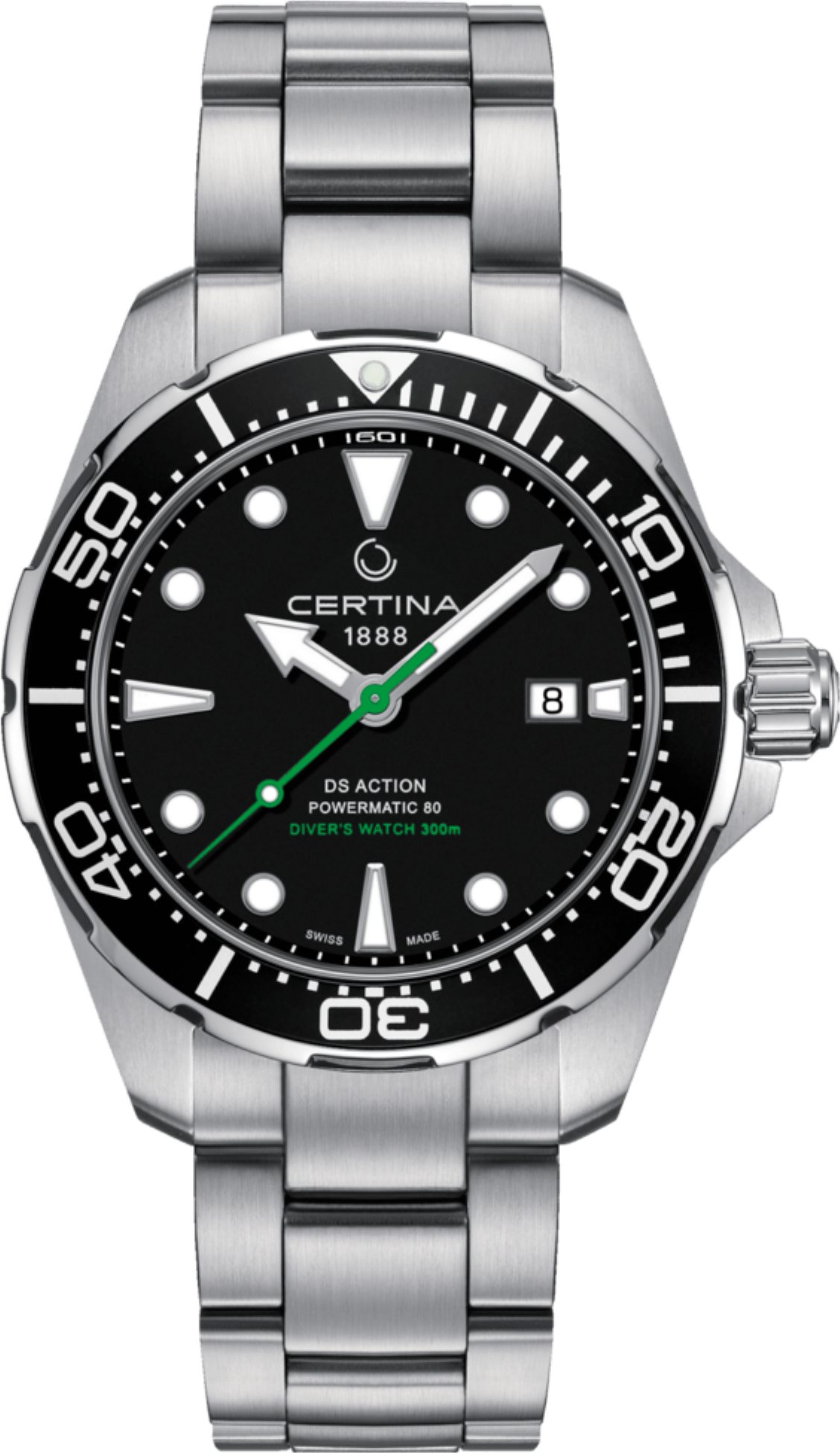 POwermatic 80 - automatický strojek s dvojnásobnou rezervou chodu oproti běžným modelům. Vysoká přesnost je zde dosažena velmi jemnou regulací šroubky setrvačce.Kromě vysoké přesnosti disponuje inovativní automatický strojek Powermatic 80 také rezervou chodu 80 hodin, což je dvojnásobek oproti srovnatelným modelům. To například znamená, že když si hodinky v pátek odložíte, v pondělí Vám stále ukazují přesný čas.Uzavřením hodinek šroubovací korunkou docílíme jednoho z nejlepších utěsnění pouzdra, které se v hodinářském průmyslu používá. Na obrázku můžeme vidět korunku ve vyšroubované poloze, ze které má poté korunka výsuvem směrem ven obvykle další dvě polohy na rychloposuv datumu a řízení času. Zatlačením korunky směrem k závitu a zašroubováním korunky k pouzdru již závit nevidíme - současně se zašroubováním korunky dotláčíme těsnění k pouzdru, čímž se hodinky až hermeticky uzavřou.Ušlechtilá nerez ocel 316L, kterou Certina používá, je mimořádně odolná,