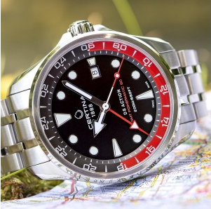 • Funkce a popis:Čas, datum, duální čas = GMT, strojek swiss ETA Powermatic 80.661 GMT – 23 kamenů = rezerva chodu 80 hodin, polokmity setrvačky 21.600/h = diference 3 - 5 vteřin denně, svítící ručky a indexy, šroubovací krytá korunka, automatický + ruční nátah