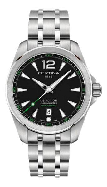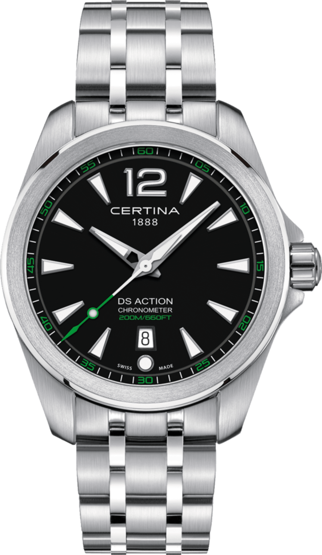 odolnost proti nárazům, abnormální tvrdost - díky tomu nenarušení povrchu ani při velké fyzické zátěži a nádherná čirá čistota, která zůstává po celou životnost sklíčka. Čtení času na hodinkách je poté radost - sklíčko je totiž stále jako nové. Safírová sklíčka se vyrábí v různých podobách a tvarech.Super-LumiNova (SLN) je luminiscenční materiál s vlastnostmi fosforu. Typ BG W9, který Certina používá, vydává ve tmě modravé světlo. Tato svítivost se ve tmě postupně ztrácí, ale na světle se automaticky obnovuje pro naplnění kapacity materiálů pro další noční či večerní svítivost.Přesný a ještě přesnější - to je chronometr. Chronometr jsou hodinky, jejichž přesnost byla oficiálně testována a ověřena nezávislou laboratoří. Tento model byl testován oficiální švýcarskou testovací laboratoří Control Officiel Suisse des Chronometres (COSC) a byl mu udělen certifikát kvalityUšlechtilá nerez ocel 316L, kterou Certina používá, je mimořádně odolná,