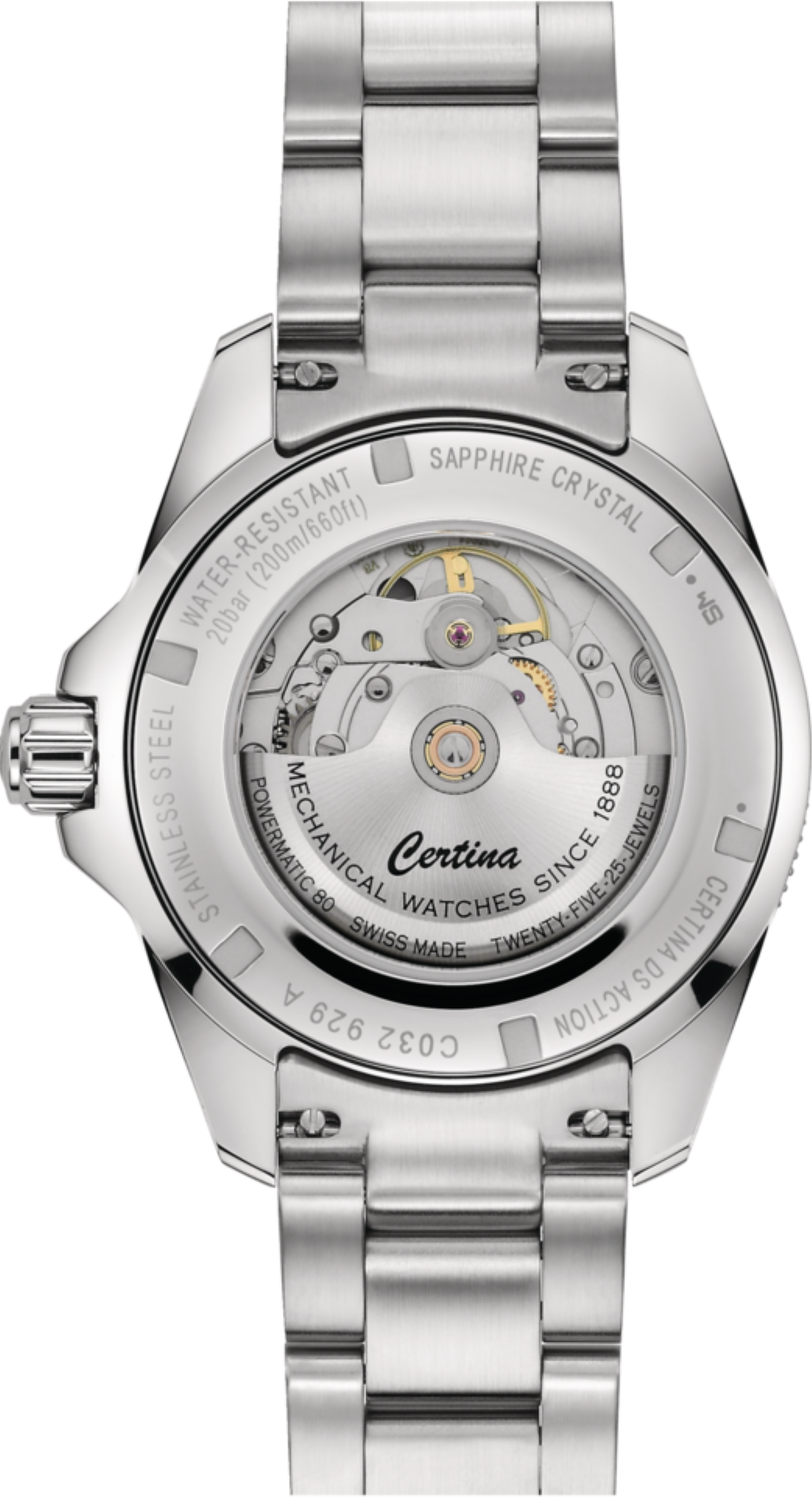 odolnost proti nárazům, abnormální tvrdost - díky tomu nenarušení povrchu ani při velké fyzické zátěži a nádherná čirá čistota, která zůstává po celou životnost sklíčka. Čtení času na hodinkách je poté radost - sklíčko je totiž stále jako nové. Safírová sklíčka se vyrábí v různých podobách a tvarech.Super-LumiNova (SLN) je luminiscenční materiál s vlastnostmi fosforu. Typ BG W9, který Certina používá, vydává ve tmě modravé světlo. Tato svítivost se ve tmě postupně ztrácí, ale na světle se automaticky obnovuje pro naplnění kapacity materiálů pro další noční či večerní svítivost.Ušlechtilá nerez ocel 316L, kterou Certina používá, je mimořádně odolná,