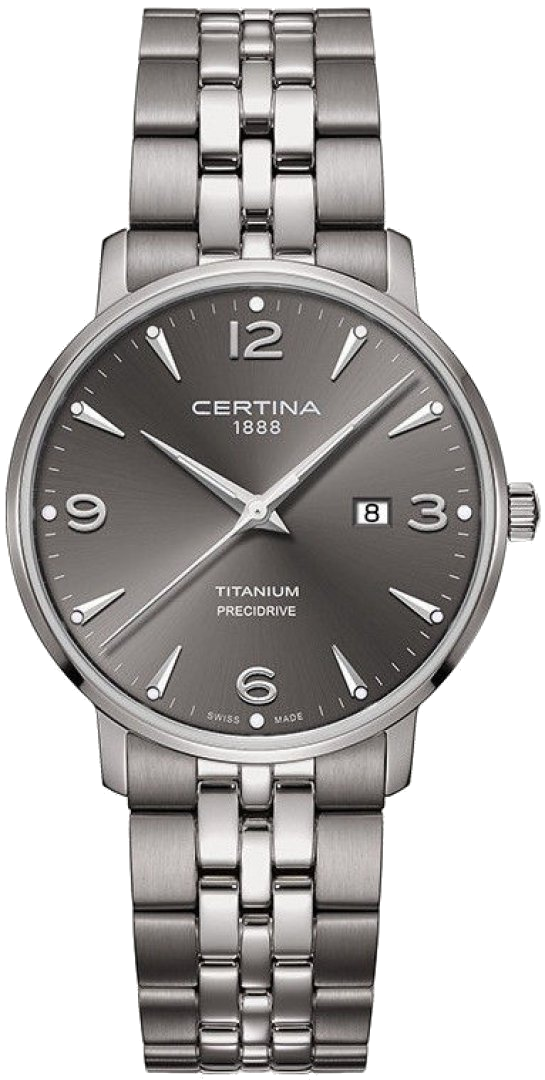 odolnost proti nárazům, abnormální tvrdost - díky tomu nenarušení povrchu ani při velké fyzické zátěži a nádherná čirá čistota, která zůstává po celou životnost sklíčka. Čtení času na hodinkách je poté radost - sklíčko je totiž stále jako nové. Safírová sklíčka se vyrábí v různých podobách a tvarech.Super-LumiNova (SLN) je luminiscenční materiál s vlastnostmi fosforu. Typ BG W9, který Certina používá, vydává ve tmě modravé světlo. Tato svítivost se ve tmě postupně ztrácí, ale na světle se automaticky obnovuje pro naplnění kapacity materiálů pro další noční či večerní svítivost.Přesný a ještě přesnější - to je chronometr. Chronometr jsou hodinky, jejichž přesnost byla oficiálně testována a ověřena nezávislou laboratoří. Tento model byl testován oficiální švýcarskou testovací laboratoří Control Officiel Suisse des Chronometres (COSC) a byl mu udělen certifikát kvalityTitan (titanium) je kovový prvek, který je mimořádně odolný, 100% hypoalergenní a antikorozivý. Jeho další předností je neobyčejná lehkost - je přibližně o polovinu lehčí než ušlechtilá nerez ocel. Tento materiál má v matném provedení elegantní šedou barvu, v lesku je čistě stříbrný.