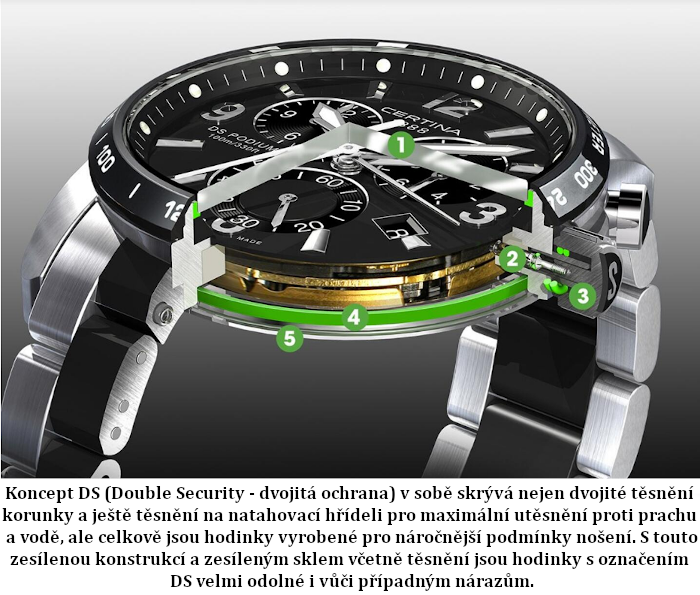 odolnost proti nárazům, abnormální tvrdost - díky tomu nenarušení povrchu ani při velké fyzické zátěži a nádherná čirá čistota, která zůstává po celou životnost sklíčka. Čtení času na hodinkách je poté radost - sklíčko je totiž stále jako nové. Safírová sklíčka se vyrábí v různých podobách a tvarech.Super-LumiNova (SLN) je luminiscenční materiál s vlastnostmi fosforu. Typ BG W9, který Certina používá, vydává ve tmě modravé světlo. Tato svítivost se ve tmě postupně ztrácí, ale na světle se automaticky obnovuje pro naplnění kapacity materiálů pro další noční či večerní svítivost.Keramika, která se používá při výrobě hodinek, je vypalovaná při teplotě vyšší jak 900° C. Keramika na hodinkách dobře vypadá a vedle své abnormální tvrdosti a odolnosti proti poškrábání se vyznačuje svojí lehkostí a barevnou stabilitou. Tento materiál je také naprosto hypoalergenní a vyrábí se v mnoha odstínech.Ušlechtilá nerez ocel 316L, kterou Certina používá, je mimořádně odolná,