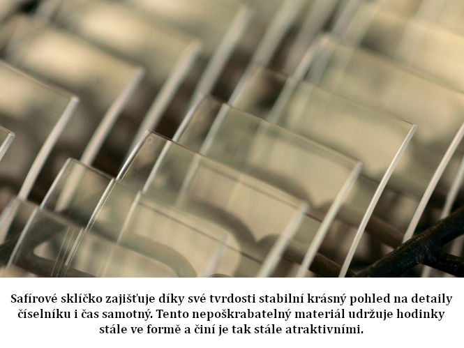 odolnost proti nárazům, abnormální tvrdost - díky tomu nenarušení povrchu ani při velké fyzické zátěži a nádherná čirá čistota, která zůstává po celou životnost sklíčka. Čtení času na hodinkách je poté radost - sklíčko je totiž stále jako nové. Safírová sklíčka se vyrábí v různých podobách a tvarech.
