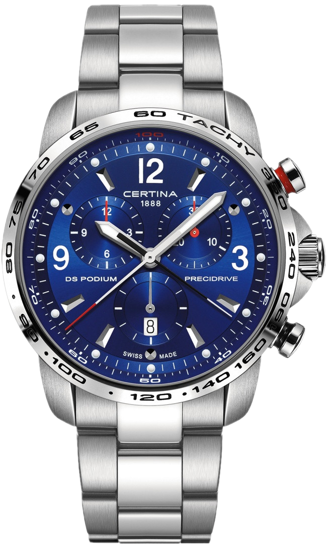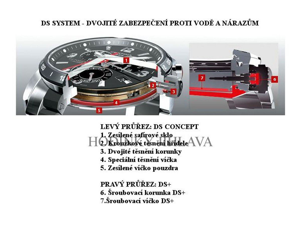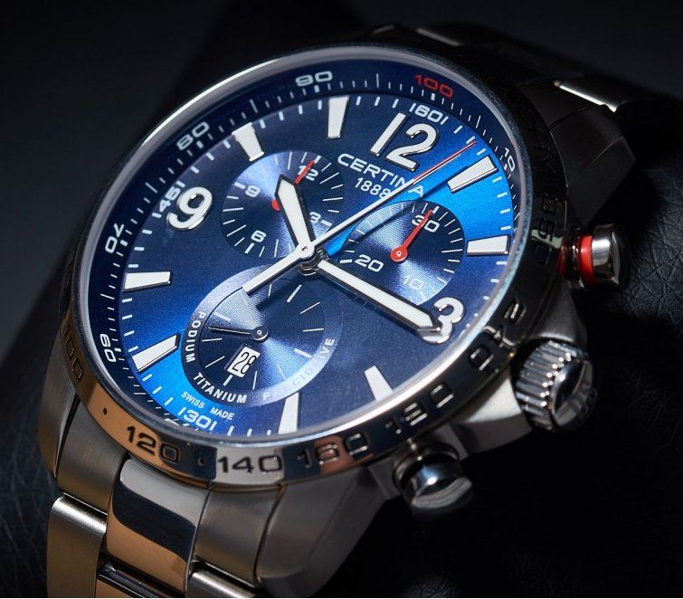 odolnost proti nárazům, abnormální tvrdost - díky tomu nenarušení povrchu ani při velké fyzické zátěži a nádherná čirá čistota, která zůstává po celou životnost sklíčka. Čtení času na hodinkách je poté radost - sklíčko je totiž stále jako nové. Safírová sklíčka se vyrábí v různých podobách a tvarech.Super-LumiNova (SLN) je luminiscenční materiál s vlastnostmi fosforu. Typ BG W9, který Certina používá, vydává ve tmě modravé světlo. Tato svítivost se ve tmě postupně ztrácí, ale na světle se automaticky obnovuje pro naplnění kapacity materiálů pro další noční či večerní svítivost.Přesný a ještě přesnější - to je chronometr. Chronometr jsou hodinky, jejichž přesnost byla oficiálně testována a ověřena nezávislou laboratoří. Tento model byl testován oficiální švýcarskou testovací laboratoří Control Officiel Suisse des Chronometres (COSC) a byl mu udělen certifikát kvalityTitan (titanium) je kovový prvek, který je mimořádně odolný, 100% hypoalergenní a antikorozivý. Jeho další předností je neobyčejná lehkost - je přibližně o polovinu lehčí než ušlechtilá nerez ocel. Tento materiál má v matném provedení elegantní šedou barvu, v lesku je čistě stříbrný.Každý quartzový chronograf je vybaven funkcí na měření desetiny vteřiny.