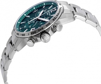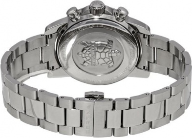 • Funkce a popis:Čas, datum, chronograf = stopky, tachymetr = km/h, quartzový strojek ETA G10.212 AA Precidrive COSC (Certifikát přesnosti chodu) - přesnost chodu s maximální odchylkou +- 10 vteřin za rok a neuvěřitelných +-0,07 vteřin za den, indikátor vybití baterie - E.O.L. (14 dní před úplným vybitím baterie indikuje vteřinová ručička přesunem po 3 vteřinách slabou baterii), svítící ručičky a indexy, krytá vodotěsná korunka, motýlková spona (velmi bezpečné a praktické zapínání)