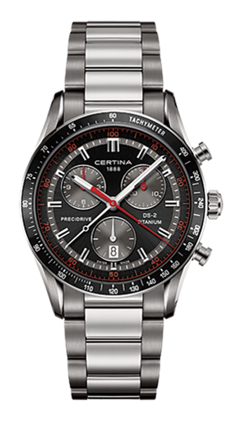 odolnost proti nárazům, abnormální tvrdost - díky tomu nenarušení povrchu ani při velké fyzické zátěži a nádherná čirá čistota, která zůstává po celou životnost sklíčka. Čtení času na hodinkách je poté radost - sklíčko je totiž stále jako nové. Safírová sklíčka se vyrábí v různých podobách a tvarech.Super-LumiNova (SLN) je luminiscenční materiál s vlastnostmi fosforu. Typ BG W9, který Certina používá, vydává ve tmě modravé světlo. Tato svítivost se ve tmě postupně ztrácí, ale na světle se automaticky obnovuje pro naplnění kapacity materiálů pro další noční či večerní svítivost.Přesný a ještě přesnější - to je chronometr. Chronometr jsou hodinky, jejichž přesnost byla oficiálně testována a ověřena nezávislou laboratoří. Tento model byl testován oficiální švýcarskou testovací laboratoří Control Officiel Suisse des Chronometres (COSC) a byl mu udělen certifikát kvalityTitan (titanium) je kovový prvek, který je mimořádně odolný, 100% hypoalergenní a antikorozivý. Jeho další předností je neobyčejná lehkost - je přibližně o polovinu lehčí než ušlechtilá nerez ocel. Tento materiál má v matném provedení elegantní šedou barvu, v lesku je čistě stříbrný.Každý quartzový chronograf je vybaven funkcí na měření desetiny vteřiny.