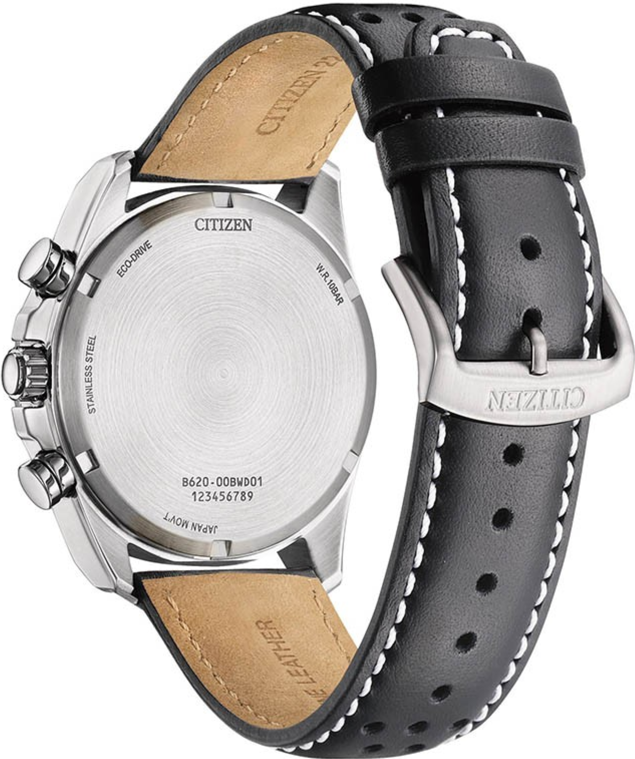 • Funkce a popis:Čas, datum, režim 12/24, chronograf = stopky, strojek quartz Japan Citizen Eco-drive Caliber B620-00M = kapacita akumulátoru (rezerva chodu) až 9 měsíců, přesnost chodu = 0 - 0,5 vteřiny denně, indikace potřeby dobití akumulátoru (hodinky dvouvteřinovými intervaly vteřinové ručičky indikují málo energie v akumulátoru a upozorňují tímto majitele/majitelku hodinek na potřebu vystavení hodinek světlu pro dobití), ručičky a indexy jsou opatřeny luminiscenční vrstvou (po krátkém nasvícení je v noci po dlouhou dobu dobře čitelný čas)
