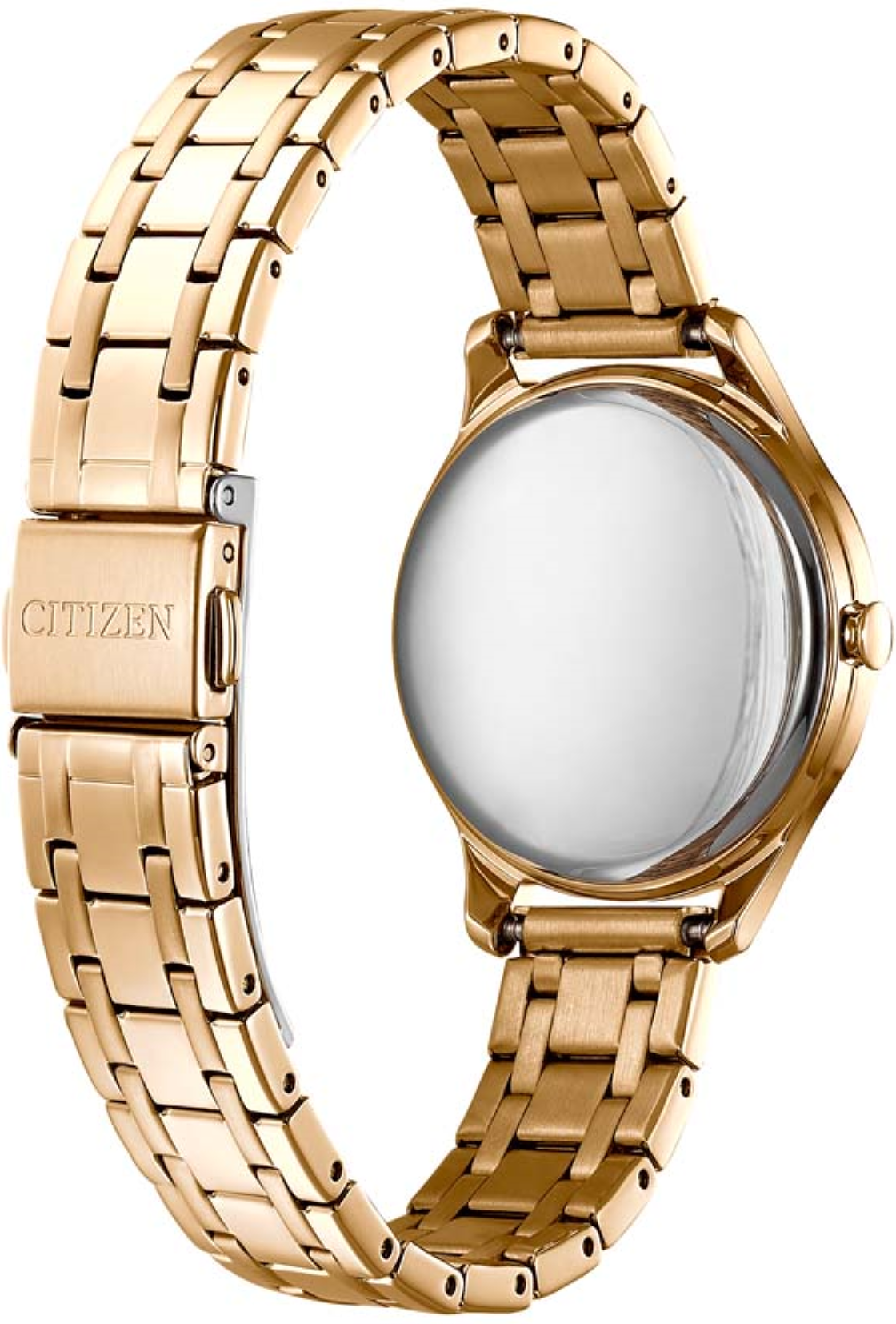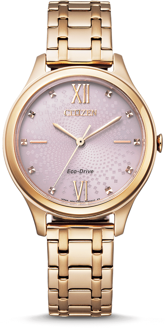 Elegantní dámské celozlacené hodinky Citizen EM0503-75X jsou na každodenní denní nošení i do společnosti a jsou opatřené systémem Eco-Drive, díky kterému majitelka nemusí řešit výměny baterií. Tento strojek si vyrábí firma Citizen.