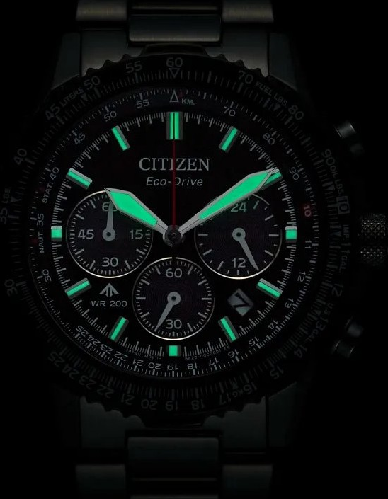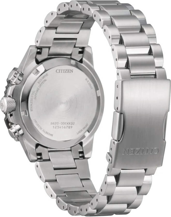 • Funkce a popis:Čas, datum, režim 12/24, chronograf = stopky, strojek quartz Japan Citizen Eco-drive Caliber B620 = kapacita akumulátoru (rezerva chodu) až 9 měsíců, přesnost chodu = 0 - 0,5 vteřiny denně, indikace potřeby dobití akumulátoru (hodinky dvouvteřinovými intervaly vteřinové ručičky indikují málo energie v akumulátoru a upozorňují tímto majitele/majitelku hodinek na potřebu vystavení hodinek světlu pro dobití), ručičky a indexy jsou opatřeny luminiscenční vrstvou (po krátkém nasvícení je v noci po dlouhou dobu dobře čitelný čas)