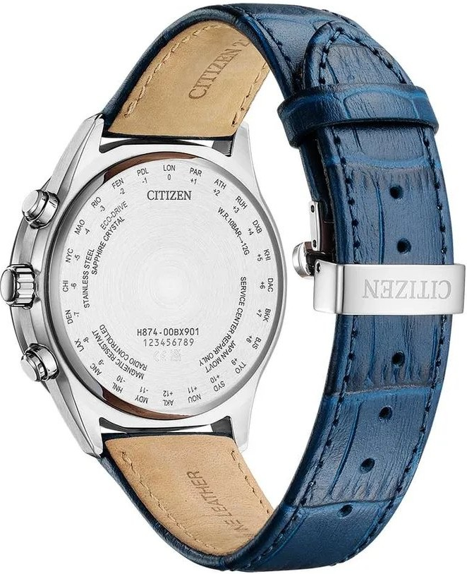 • Funkce a popis:Čas, datum, strojek Eco-Drive kalibr H874 Radio Controlled - rádiovým signálem řízený čas (naprosto přesné hodinky), světové časy, režim 12/24, svítící ručky a indexy, systém Eco-drive - dobíjení akumulátoru umělým i přírodním světlem (energie pro pohon strojku při úplném nabití akumulátoru) = rezerva chodu: 2,5 roku, ukazatel rezervy chodu, automatický kalendář, světové časy, časová pásma, letní čas, ukazatel měsíční fáze, vysílače rádiového signálu: DCF, WWVB, JJY, BPC, automatická aktivace příjmu signálu, manuální aktivace příjmu signálu, potvrzení stavu příjmu, ukazatel výsledku posledního příjmu, energeticky úsporný režim, výstraha potřeby dobití, ochrana proti přílišnému nabití, automatická korekce ruček, antimagnetické provedení, detekce nárazů, automatický výpočet fáze mesíce, funkce přepínání fáze měsíce (severní/jižní polokoule), funkce manuální úpravy fáze měsíce