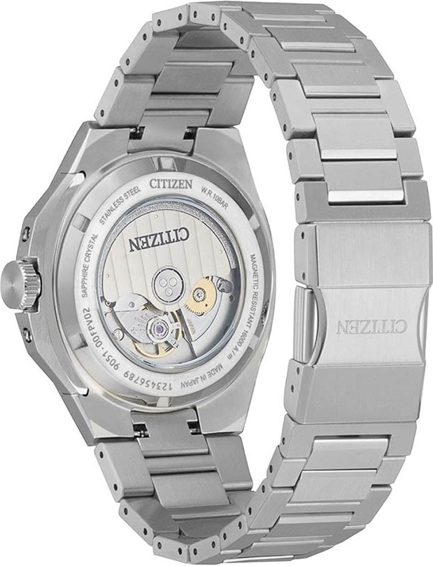 • Funkce a popis:Čas, datum, mechanický strojek Citizen kalibr 9051 s automatickým nátahem a s frekvencí 28800 polokmitů za hodinu (4Hz) a má 24 kamenných uložení, rezerva chodu až 42 hodin,safírové sklíčko, funkce "Hacking", tedy zastavení sekundové ručky při nařízení hodinek a možnost manuálního nátahu korunkou, luminiscence na ručkách a indexech, náhled na strojek skrz zadní víčko