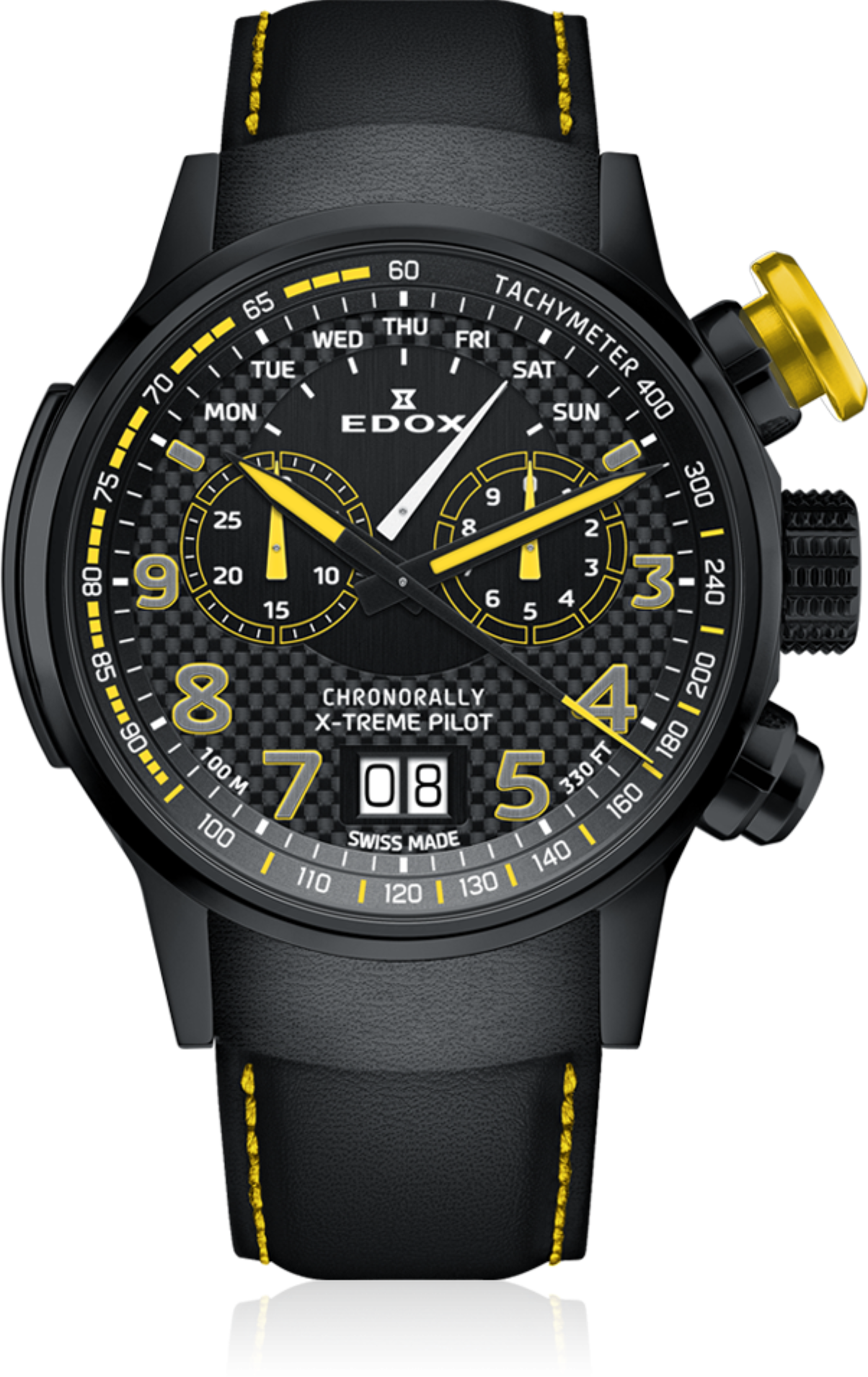 • Funkce a popis:Čas, velký datum, den v týdnu, chronograf = stopky, strojek Swiss Ronda 8040 N quartz = přesnost chodu 0 - 0,4 vteřiny denně, ručičky a indexy jsou opatřeny vrstvou Super-LumiNova (svit v noci i za šera), kožený černý řemínek Edox se žlutým prošitím, dominantní žluté tlačítko na spouštění stopek