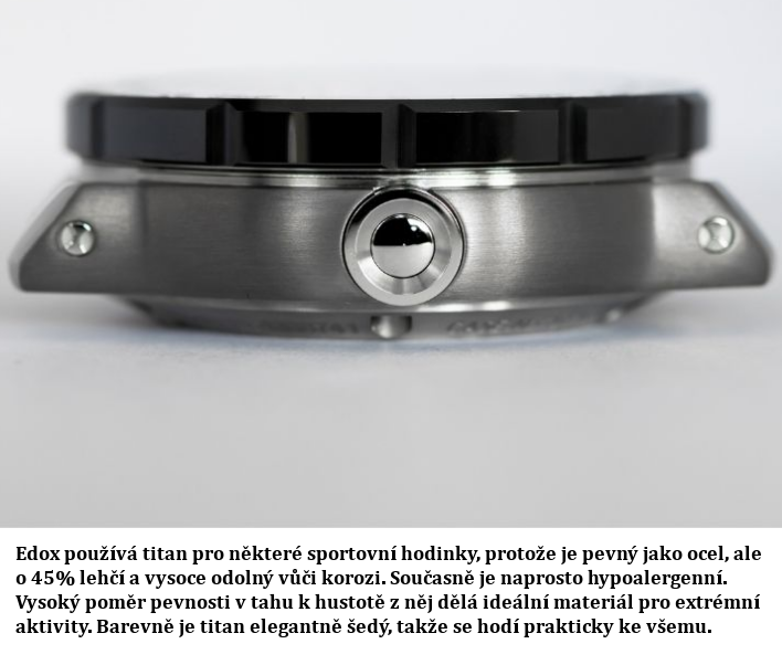 Edox používá titan pro některé sportovní hodinky, protože je pevný jako ocel, ale o 45% lehčí než ocel a vysoce odolný vůči korozi. Současně je vysoce hypoalergenní. Vysoký poměr pevnosti v tahu k hustotě z něj dělá ideální materiál pro extrémní aktivity. Barevně je titan elegantně šedý, takže se hodí prakticky ke všemu.
