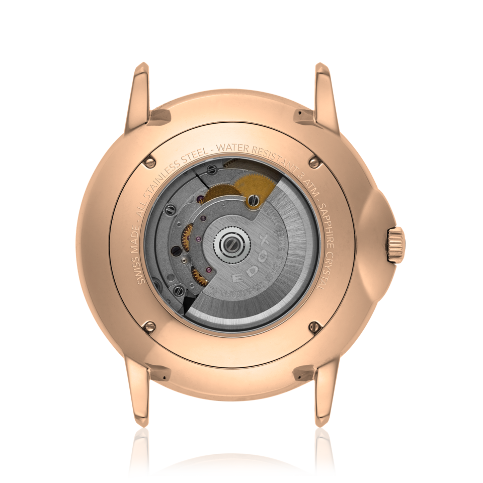 • Funkce a popis:Čas, datum, strojek Swiss Sellita SW 200 (26 kamenů), rezerva chodu 42 hodin, polokmity setrvačky 28.800/h = diference 2 - 4 vteřiny denně, automatický + ruční nátah, zapínání pásku - motýlková spona (praktické a pevné elegantní zapínání), průhledné zadní víčko pouzdra pro náhled na strojek, krytá korunka umístěna na levé straně pouzdra