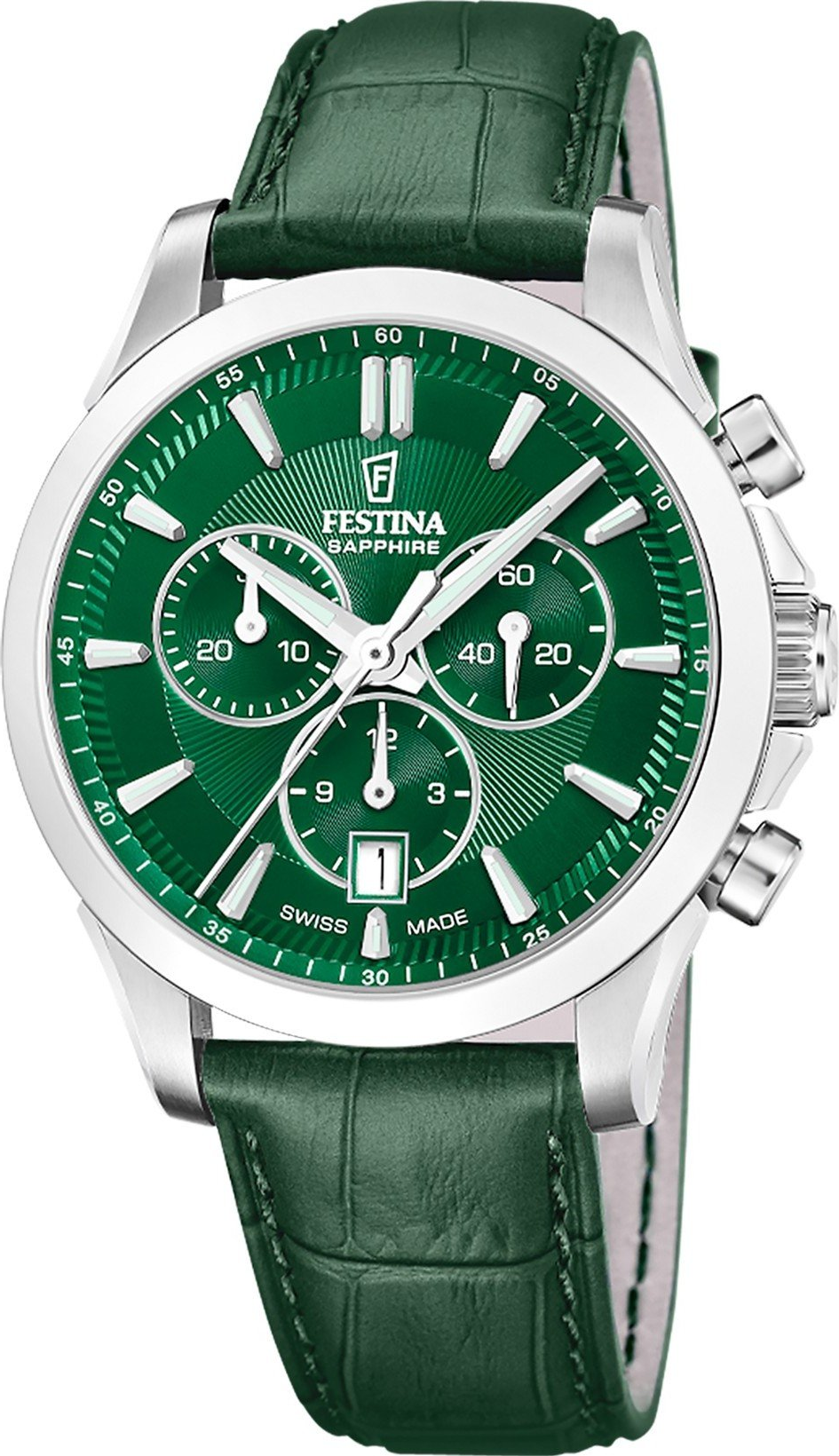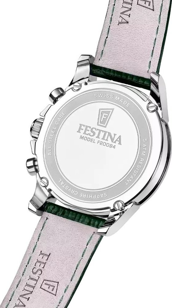 Festina Swiss Made Chrono 20094/4 jsou pánské hodinky Festina, které spojují sportovní eleganci a praktičnost chronografu v čistém, moderním provedení. Vizuálně staví na výrazné zelené kombinaci - zelený číselník a zelený kožený řemínek působí originálně, ale stále dospěle a snadno nositelně. Díky označení Swiss Made cílí na zákazníky, kteří chtějí přesnost quartzového chodu a zároveň reprezentativní doplněk pro ...