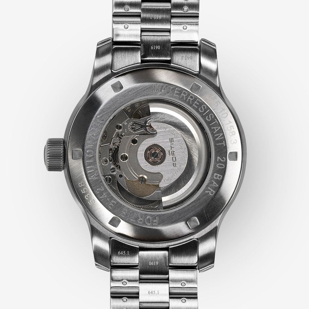 • Funkce a popis:Čas, datum, den v týdnu (dvojjazyčně - anglicky a německy), strojek Swiss Fortis UW-31 (základ Eta 2836-2 = 25 kamenů), rezerva chodu 38 hodin, polokmity setrvačky 28.800 za hodinu = přesnost chodu 2 - 4 vteřiny denně, automatický nátah (pohyb ruky) + ruční nátah (hodinky lze také natahovat i korunkou), svítící ručičky a indexy (Superluminova), průhledné (prosklené) zadní víčko pro náhled na strojek