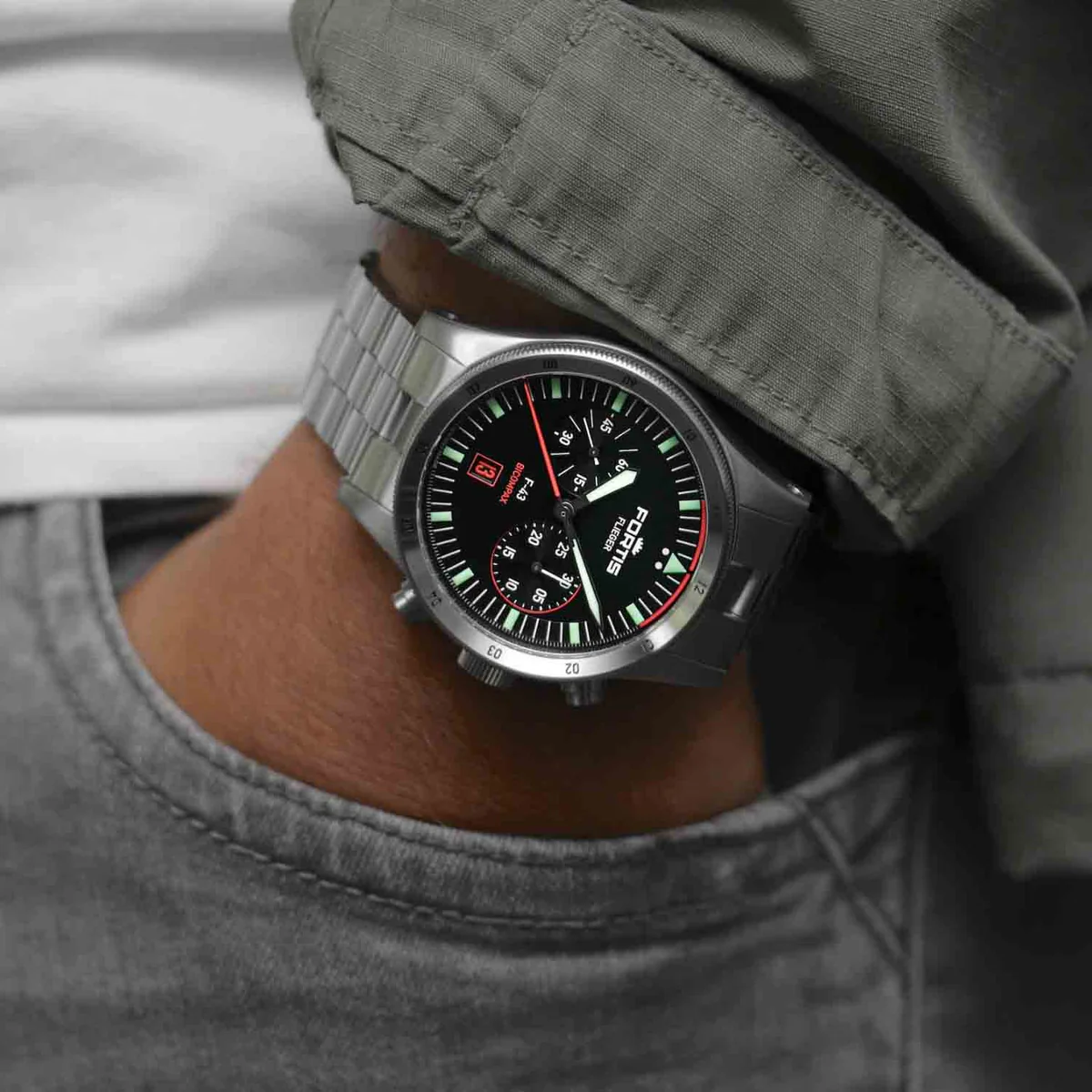 • Funkce a popis:Čas, datum, chronograf = stopky, strojek Swiss UW-51 (25 kamenů) s precizní regulací = v praxi  je nejčastěji přesnost chodu (diference) 2 - 3 vteřiny denně, krokové ústrojí ocel/kámen, rezerva chodu 48 hodin, polokmity setrvačky 28.800/h (4 Hz), automatický nátah (hodinky se natahují pohybem ruky) + ruční nátah (hodinky lze natáhnout/dotáhnout dle potřeby i ručně korunkou), ručičky a indexy jsou opatřeny tenkou svítící vrstvou - tento materiál si dokáže udržet světlo a po krátkém nasvícení dlouhou dobu svítí (Brixtrack®, Superluminova® X1 se zeleným dosvitem, Synchroline®)