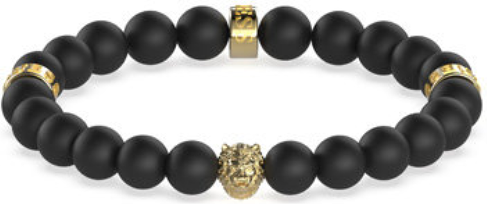 Elastický náramek z lávových kamenů, ozdoben pozlacenými, ocelovými korálky s logem Guess a středním korálkem ve tvaru lva ve velikosti 1 x 1,2 cm.