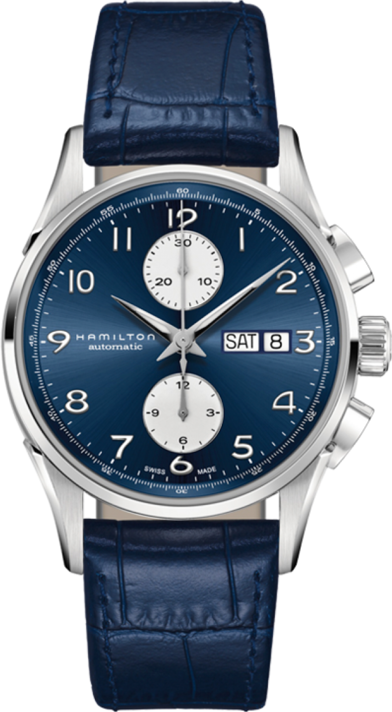 • Funkce a popis:Čas, datum, den v týdnu, chronograf = stopky, strojek Hamilton swiss H-21 (základ Eta Valjoux 7750 - 27 kamenů), rezerva chodu 60 hodin, polokmity setrvačky 28.800 za hodinu = přesnost chodu 2 - 4 vteřiny denně, křemíkový vlásek - téměř antimagnetický s bezkonkurenční stabilitou pro přesnost chodu strojku a větší stabilitou proti nárazům, automatický + ruční nátah, průhledné zadní víčko pro náhled na strojek, zapínání pásku - klasická spona (pevné bezpečné zapínání), svítící ručičky