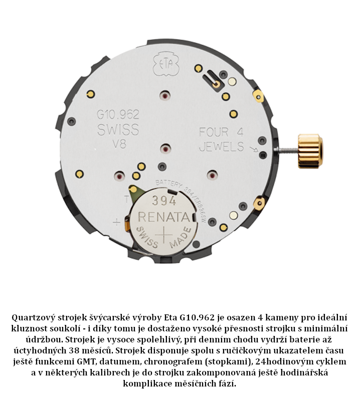 Quartzový strojek švýcarské výroby Eta G10.962 je osazen 4 kameny pro ideální