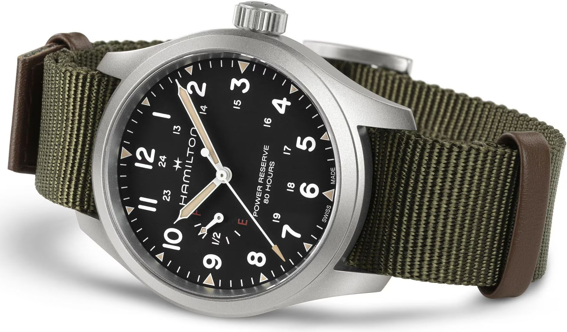 Řemínek je vyroben z textilu a má modrou barvu, kterou potvrzuje slovní popis oficiální produktové karty. Jde o odolné NATO provedení, které výborně odpovídá vojenskému charakteru modelu a současně podporuje každodenní pohodlí. Zapínání tvoří trnová spona, jejíž hlavní výhodou je lehkost, jednoduchost a snadné přesné nastavení podle zápěstí. Modrý NATO řemínek vytváří s modrým číselníkem a ocelovým pouzdrem velmi soudržnou a současnou kombinaci, která působí svěže, technicky a přitom velmi nositelně. H70455940 se velmi dobře hodí k tričku, lehké bundě, košili i ke sportovně městskému outfitu. Textilní řemínek navíc snižuje celkovou hmotnost hodinek a zvyšuje komfort při delším nošení. Právě v této lehkosti, čitelnosti a barevné vyváženosti spočívá velká síla celé reference. Jde o model, který nepůsobí agresivně, ale stále má jasně definovaný charakter.