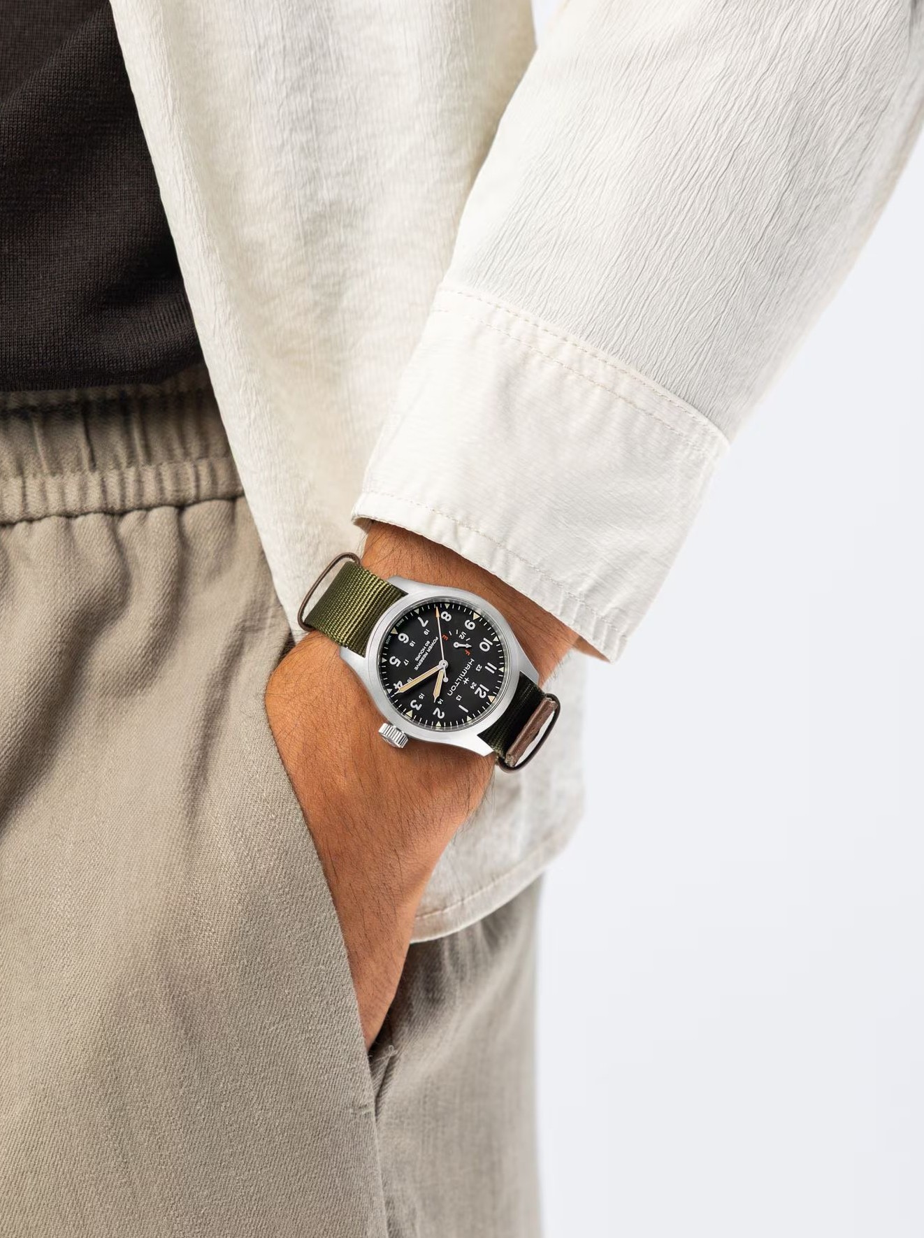 Hamilton Khaki Field Auto H70455940 se skvěle hodí k lehké bundě, košili, tričku i k modernímu městskému outfitu s funkčním základem. Na ruce působí svěže, technicky a velmi přirozeně. Jsou to hodinky pro člověka, který chce Hamilton s automatickým nátahem, modrým číselníkem a modrým NATO řemínkem v moderní a dobře nositelné field kombinaci. Tato reference outfit velmi dobře doplní a současně nabídne vysokou čitelnost, dlouhou rezervu chodu a mechanický základ s moderní odolností. Hodí se pro každého, kdo chce poctivé field hodinky s aktivním charakterem, ale stále s dostatkem civilní použitelnosti pro každý den. Právě tímto propojením barevné svěžesti, lehkosti a mechanické poctivosti si H70455940 získávají pozornost.