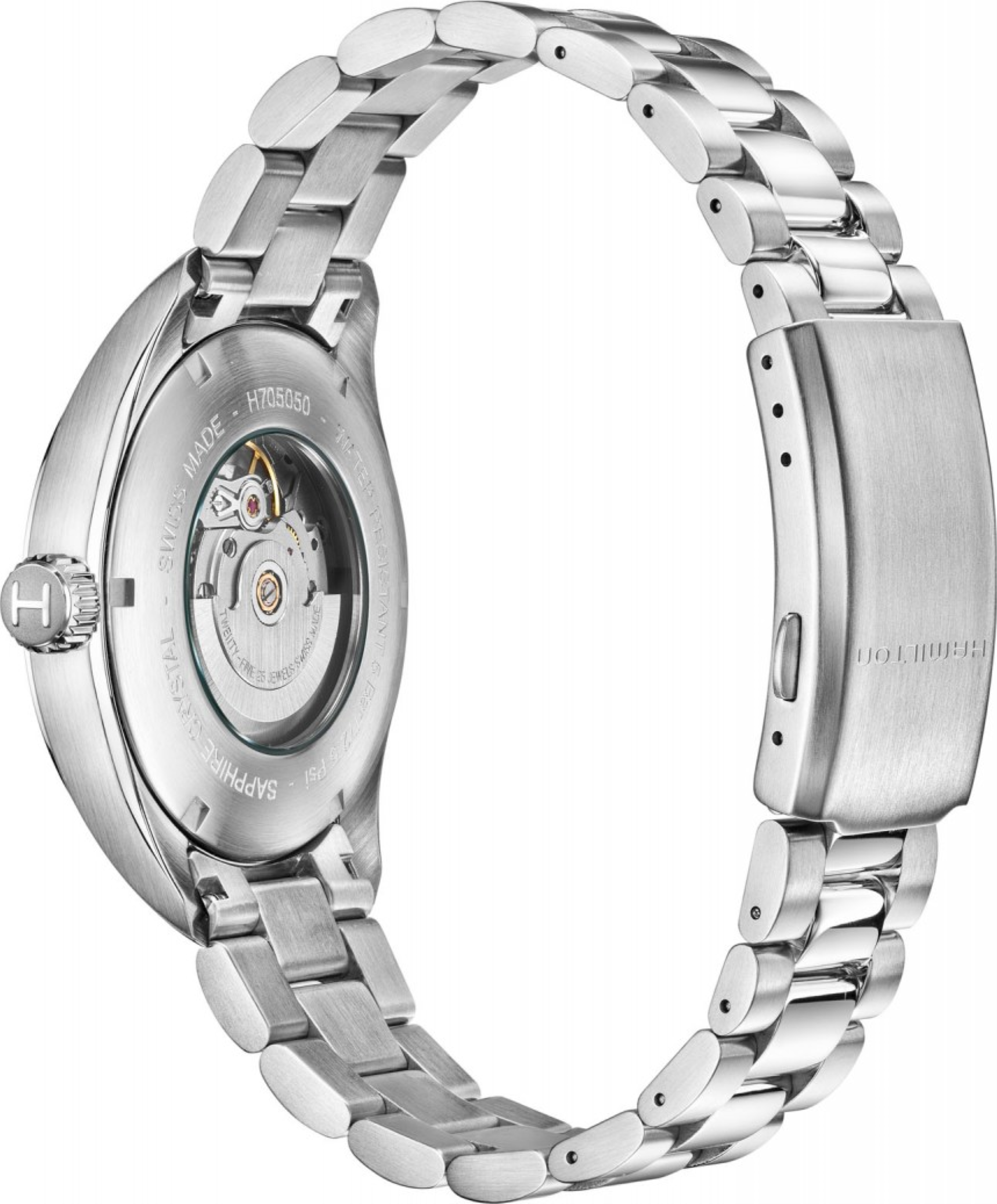 • Funkce a popis:Čas, datum, den v týdnu, režim 12/24, strojek swiss kalibr H-30 (krokové ústrojí ocel/kámen) - vyráběn firmou Eta exklusivně pro Hamilton (25 kamenů), rezerva chodu 80 hodin, polokmity setrvačky 21.600/h = přesnost chodu 3 - 5 vteřin denně - nižší kmity setrvačky jsou vyladěny jemnou regulací na maximální přesnost strojku, úprava rotoru samonátahu dle vzoru Hamilton - rotor zaopatřen speciálními výřezy na tlumení případných nárazů hodinek během nošení, průhledné zadní víčko pro náhled na strojek, svítící ručky a indexy, automatický + ruční nátah