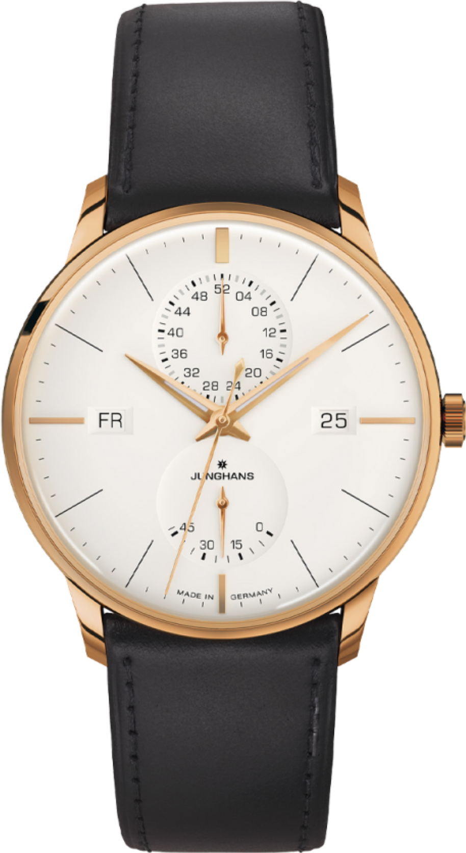 • Funkce a popis:Čas, datum, den v týdnu, ukazatel rezervy chodu, strojek s automatickým nátahem Junghans J810.5 (25 kamenů) - rezerva chodu 42 hodin, polokmity setrvačky 28.800/h = diference 2 - 4 vteřiny denně, automatický nátah (pohybem ruky) + ruční nátah (hodinky lze natáhnout i mechanicky - ručně), luminiscenční vrstva (svítící) v ručičkách, do hodinek lze vsadit za příplatek safírové nepoškrabatelné sklíčko
