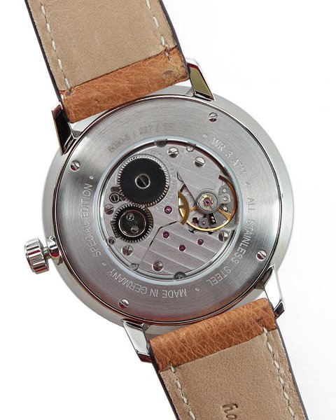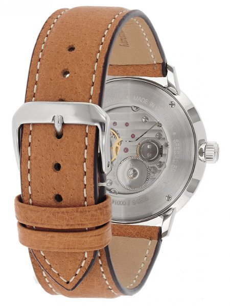 • Funkce a popis:Čas, mimostředná vteřinová ručička, automatický strojek ETA 7001 (17 kamenů), rezerva chodu 46 hodin, kmity setrvačky 18.000/h = diference 3 - 4 vteřiny denně, svítící ručky a indexy, průhledné zadní víčko