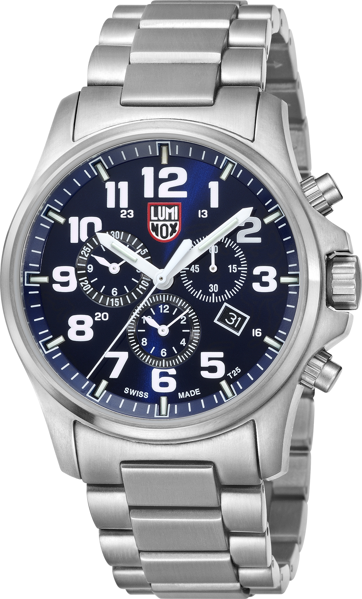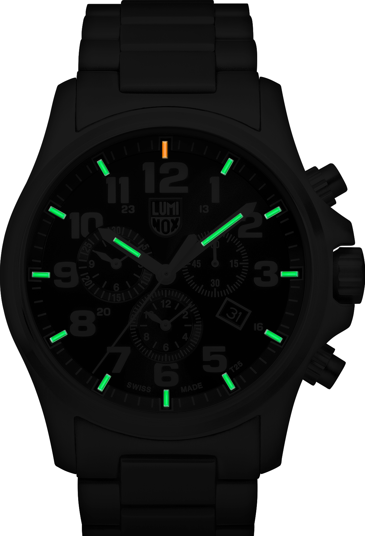 • Funkce a popis:Čas, datum, chronograf = stopky, strojek swiss Quartz Ronda, svítící ručky a indexy. Osvětlení Luminox s vlastním napájením.