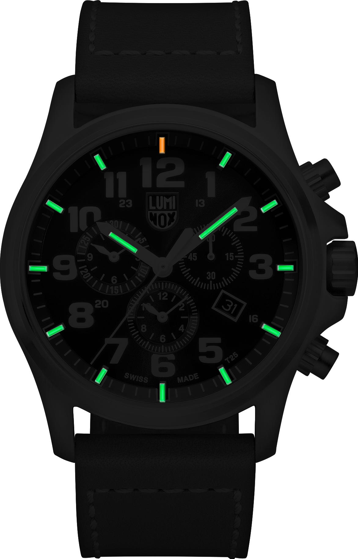 • Funkce a popis:Čas, datum, chronograf = stopky, strojek swiss Quartz Ronda, svítící ručky a indexy. Osvětlení Luminox s vlastním napájením.