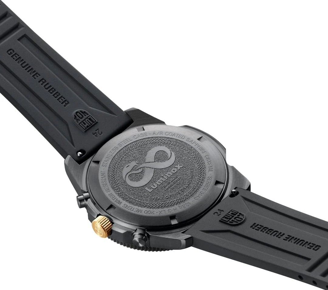 • Funkce a popis:Čas, datum, den v týdnu, chronograf=stopky, svítící ručky a indexy, jednosměrně otočná karbonová luneta, noční osvětlení Luminox Light Technology, šroubovací korunka, švýcarský quartzový strojek RONDA Z60 s výdrží baterie až 42 měsíců