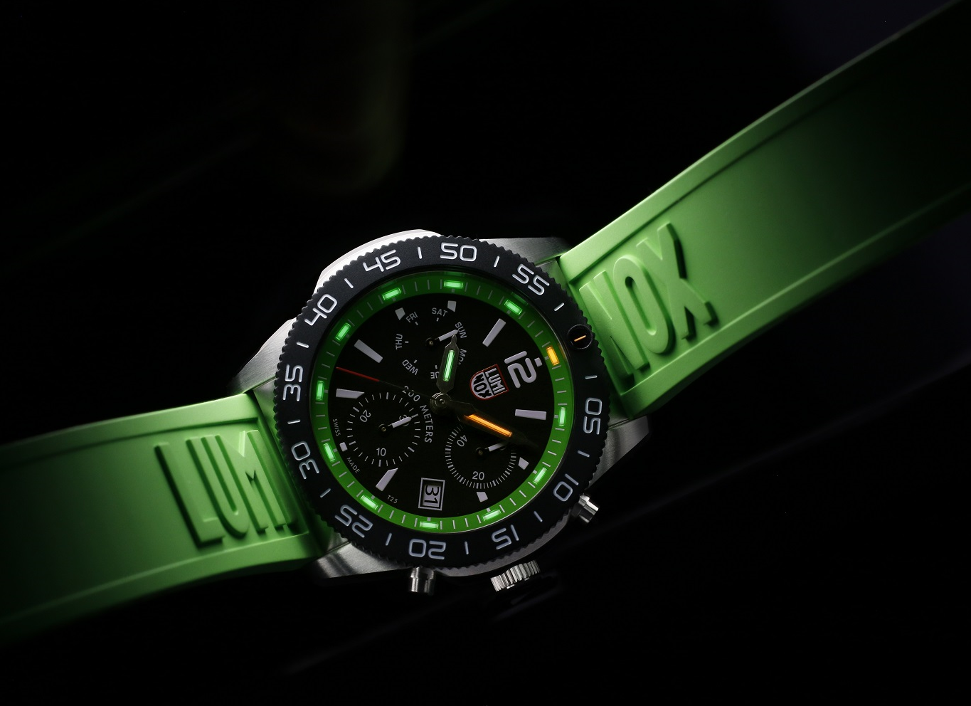 • Funkce a popis:Čas, datum, den v týdnu, chronograf=stopky, svítící ručky a indexy, jednosměrně otočná karbonová luneta, noční osvětlení Luminox Light Technology, šroubovací korunka, švýcarský quartzový strojek RONDA Z60 s výdrží baterie až 42 měsíců