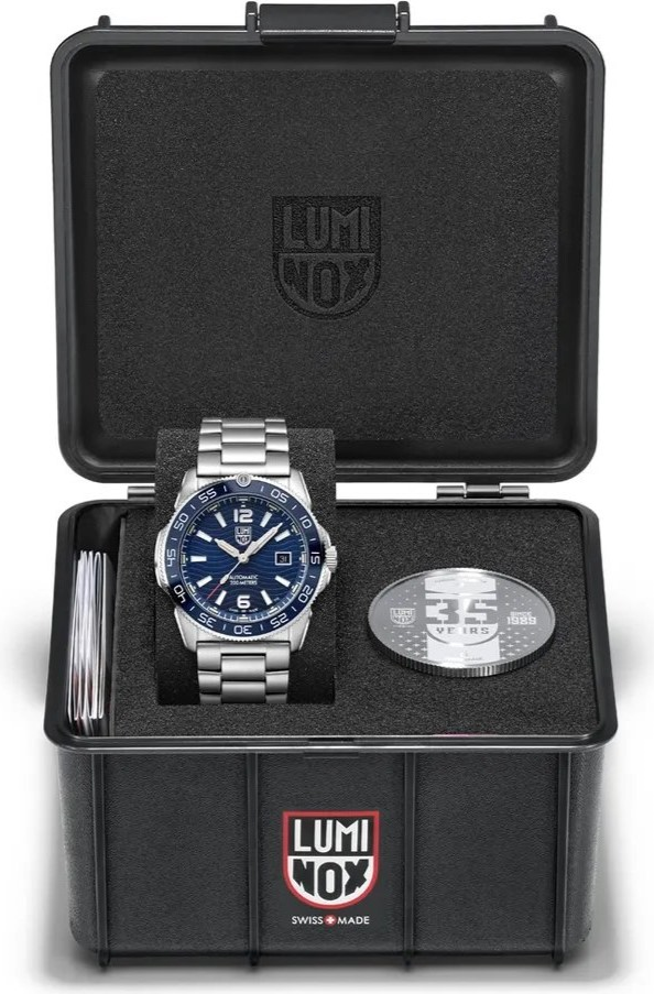 Luminox Pacific Diver Automatic 3100 Series XS.3104 jsou automatické sportovní hodinky, které velmi přesvědčivě spojují mechanický strojek, keramickou lunetu a výrazný modrý číselník s texturou mořských vln. Pouzdro je vyrobeno z ušlechtilé nerezové oceli 316L a má průměr 42 mm. Tato velikost je pro sportovní automat velmi dobře zvolená, protože hodinky působí dostatečně robustně, ale stále velmi pohodlně sedí i na běžném zápěstí. Řada Pacific Diver ...