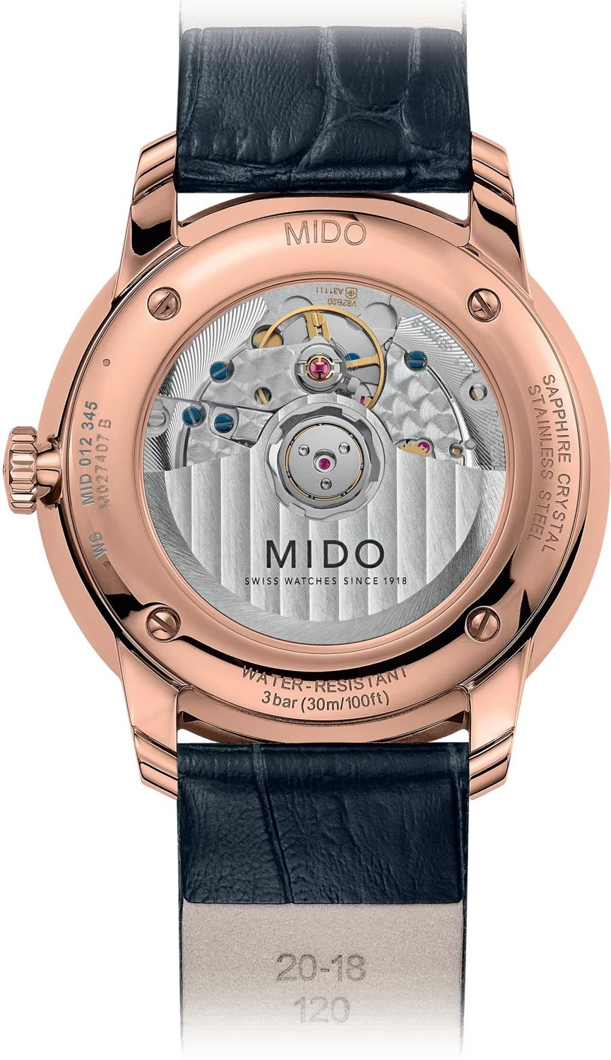 • Funkce a popis:Čas, datum, strojek Swiss automatic Mido caliber 72 (21 kamenů) = rezerva chodu 72 hodin, polokmity setrvačky 25.200/h = přesnost chodu 3 - 4 vteřiny denně, automatický (pohyb ruky) + ruční nátah (hodinky lze také natahovat i korunkou), průhledné zadní víčko pro náhled na strojek, tyto hodinky patří mezi jedny z nejtenčích hodinek s automatickým strojkem na světě - na výšku mají pouhých 7,3 mm