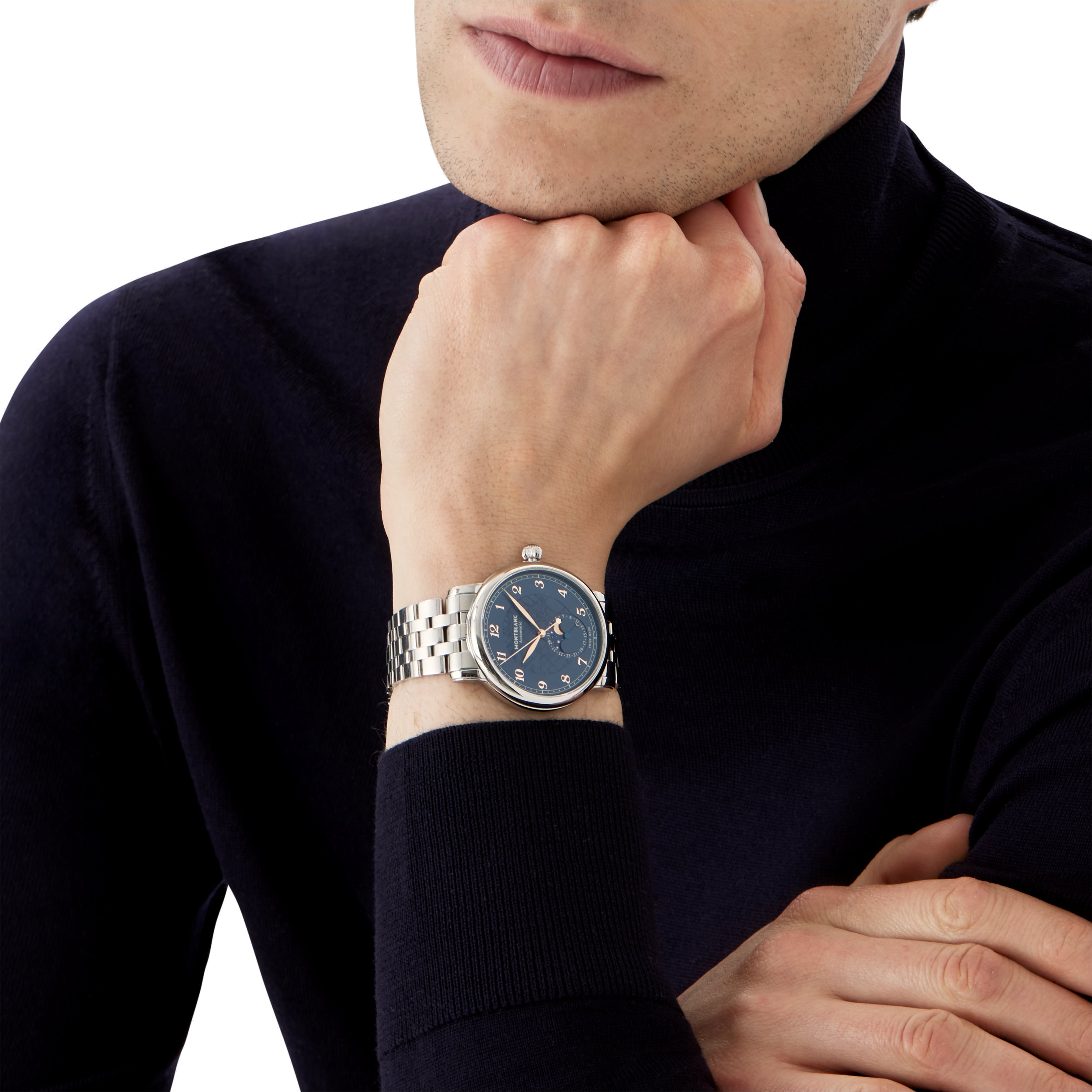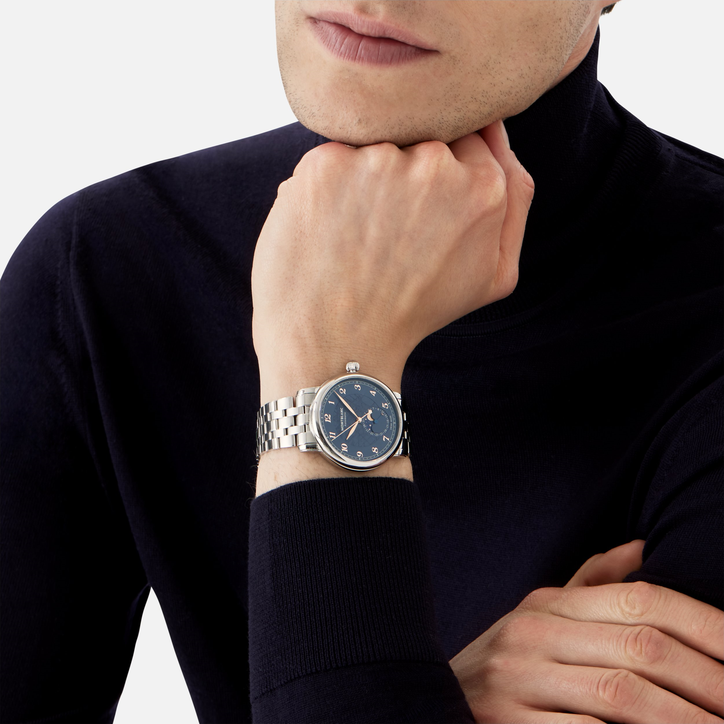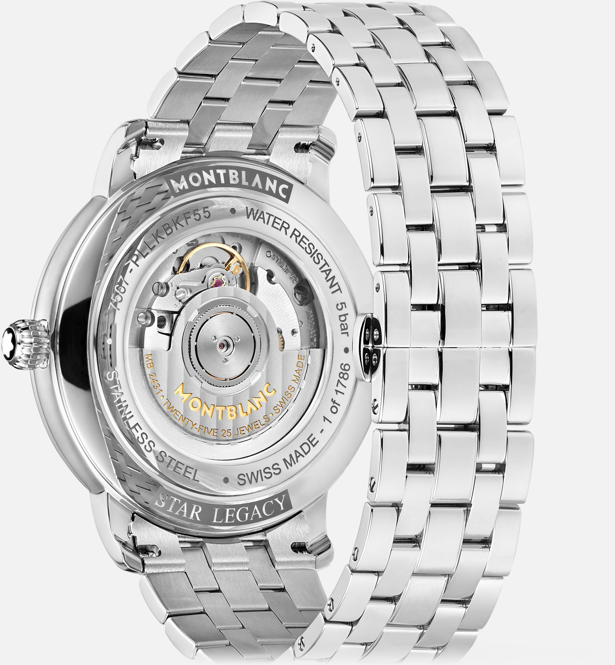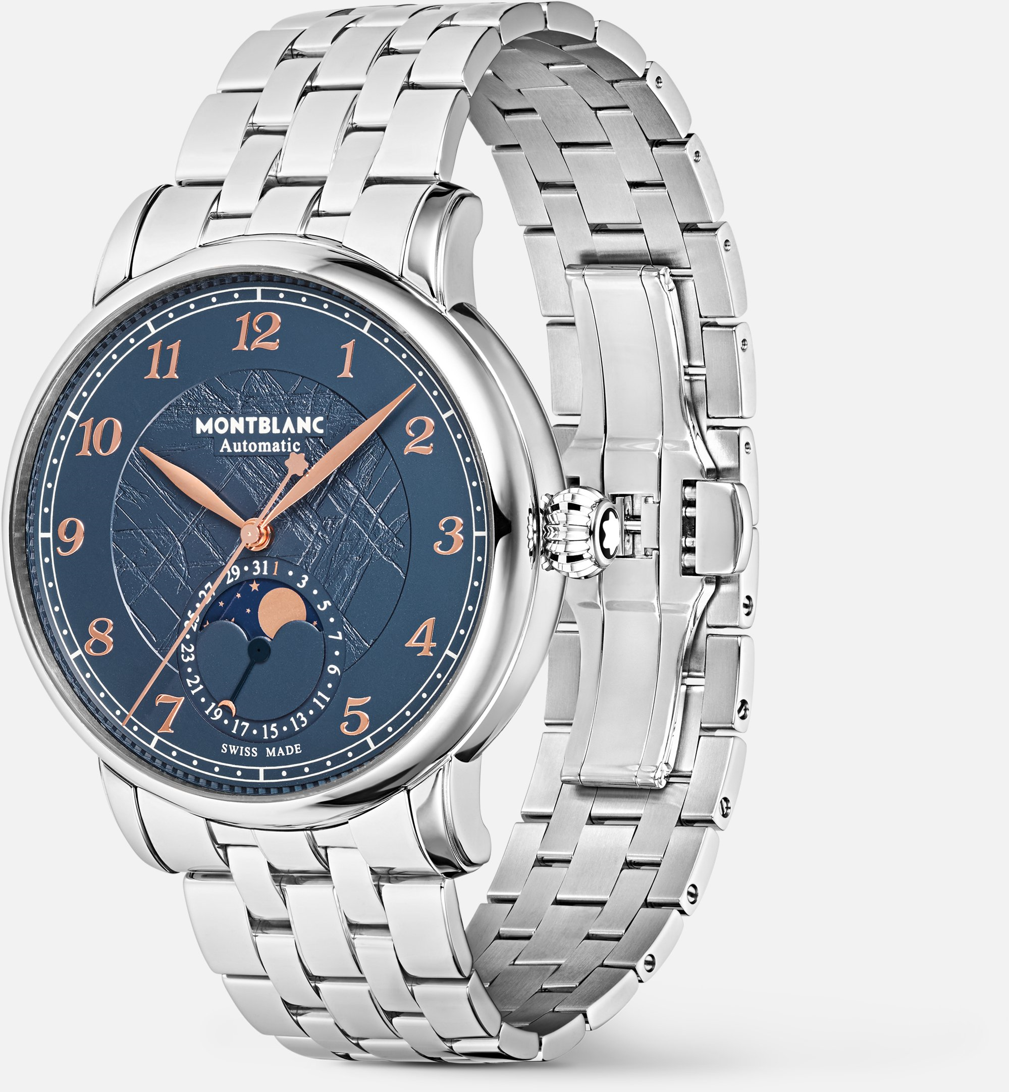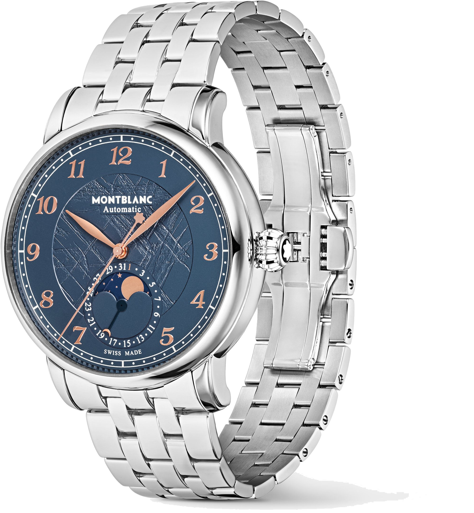 • Funkce a popis:Čas, datum,moonphase, strojek Swiss Montblanc MB 24.31 (základ Sellita SW 200-1) = rezerva chodu 38 hodin,  krokové ústrojí ocel/kámen, polokmity setrvačky 28.800/h (4 Hz) = přesnost chodu (diference) 2 - 4 vteřiny denně, 25 kamenů, automatický nátah (hodinky se natahují pohybem ruky) + ruční nátah (hodinky lze natáhnout/dotáhnout dle potřeby i ručně korunkou), rotor samonátahu disponuje funkcí oboustranného nátahu
