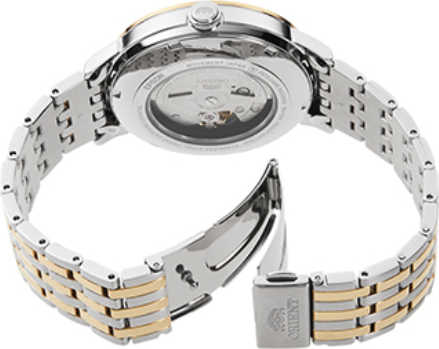 • Funkce a popis:Čas, datum, strojek automat Japan Orient Cal. 40S62 (24 kamenových uložení), rezerva chodu 40 hodin, 21.600 polokmitů setrvačky za hodinu = přesnost chodu -7 - +17 vteřin denně, automatický nátah (pohyb ruky), průhledné zadní sklíčko pro náhled na strojek.