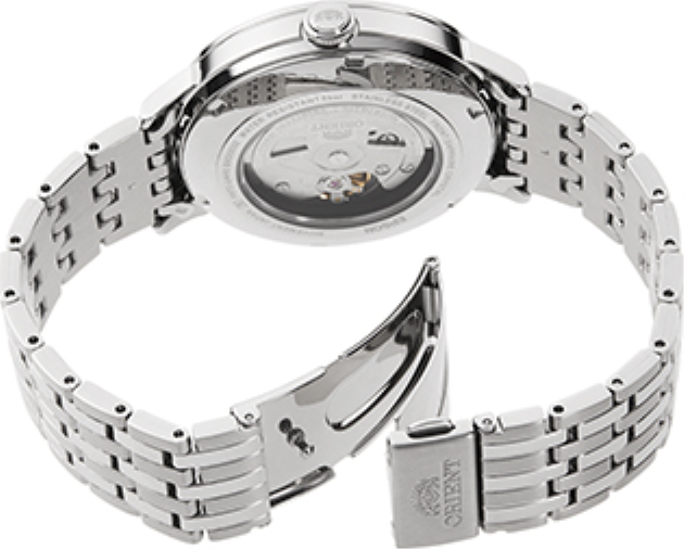 • Funkce a popis:Čas, datum, strojek automat Japan Orient Cal. 40S62 (24 kamenových uložení), rezerva chodu 40 hodin, 21.600 polokmitů setrvačky za hodinu = přesnost chodu -7 - +17 vteřin denně, automatický nátah (pohyb ruky), průhledné zadní sklíčko pro náhled na strojek.