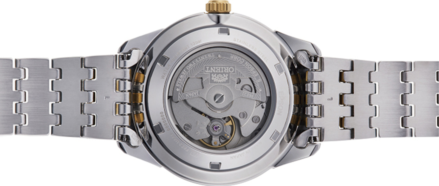 • Funkce a popis:Čas, datum, den v týdnu, strojek automat Japan Orient Cal. F7R62 (22 kamenových uložení), rezerva chodu 40 hodin, 21.600 polokmitů setrvačky za hodinu = přesnost chodu -7 - +17 vteřin denně, automatický nátah (pohyb ruky) + ruční nátah (hodinky lze také natahovat i korunkou)
