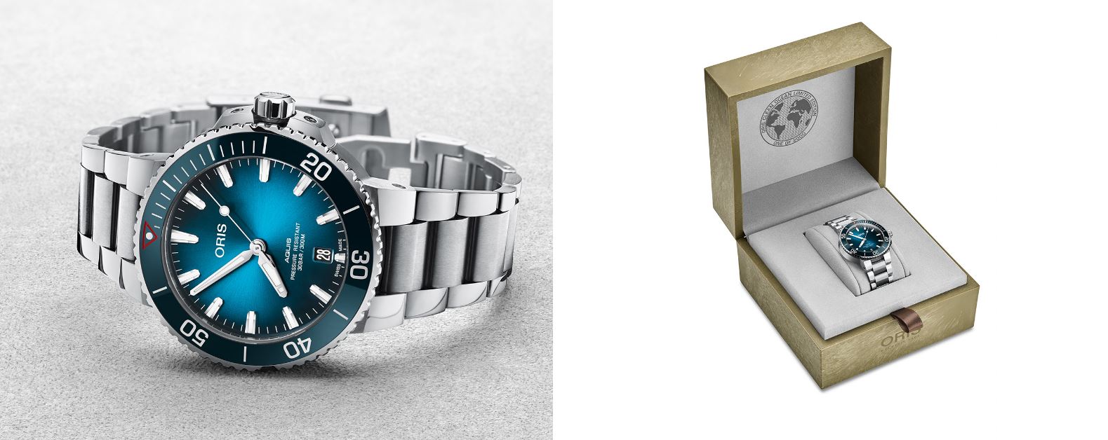 • Funkce a popis:Čas, datum, strojek Swiss Oris 733 (základ Sellita SW 200-1 / Eta 2824) = 26 kamenových uložení, 28.800 polokmitů setrvačky za hodinu (4Hz) = přesnost chodu 2 - 4 vteřiny denně, rezerva chodu 38 hodin, hodinky se natahují automaticky (pohybem ruky) + lze natáhnout/dotáhnout hodinky i ručně korunkou, ručičky a indexy jsou potažené svítící (luminiscenční) vrstvou (Super-LumiNova), každý z 2 000 vyrobených kusů bude uveden ve speciálních krabičkách z ekologicky šetrných řas s recyklovanými plastovými vložkami