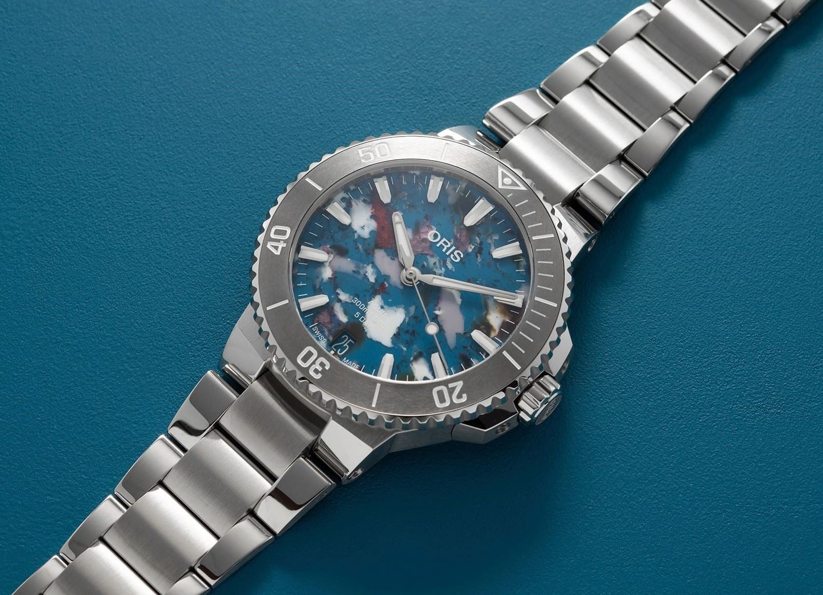 Seznamte se s Oris Aquis Date Upcycle 01 733 7787 4150-07 8 22 04PEB 41,50 mm. Vychází z luxusních každodenních hodinek a obsahuje číselník vyrobený z recyklovaného PET plastu, díky kterému je každý číselník jedinečný. Recyklace PET plastů vytváří na číselnících náhodné vzory, což znamená, že žádné dva číselníky nebudou stejné. Ve skutečnosti je tedy  ...