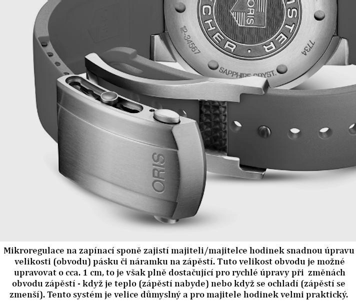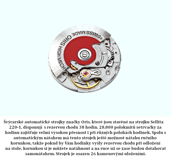 firmy Oris www.oris.ch (odkaz https://my.oris.ch/en/myoris).Švýcarské automatické strojky značky Oris, které jsou stavěné na strojku Sellita 200-1, disponují s rezervou chodu 38 hodin. 28.800 polokmitů setrvačky za hodinu zajišťuje velmi vysokou přesnost i při různých polohách hodinek. Spolu s automatickým nátahem má tento strojek ještě možnost nátahu ručního korunkou, takže pokud by Vám hodinky vyšly rezervu chodu při odložení na stole, korunkou si je můžete natáhnout a na ruce už se zase budou dotahovat samonátahem. Strojek je osazen 26 kamenovými uloženími.Vodotěsnost hodinek zaručuje komfort pro zákazníka nejen v podobě v podobě bezstarostného namočení se s hodinkami či vykoupání se s nimi (dle vodotěsnosti modelu), ale dokonale uzavřené pouzdro proti vodě současně podstatně lépe utěsní hodinky proti mikroprachu a tudíž velice dobře ochrání stroj uvnitř pouzdra. Lze také říci, že čím jsou hodinky vodotěsnější, tím jsou i konstrukčně bytelnější a tudíž jsou i lépe připravené na případné nárazy během nošení.Mikroregulace na zapínací sponě zajistí majiteli/majitelce hodinek snadnou úpravu