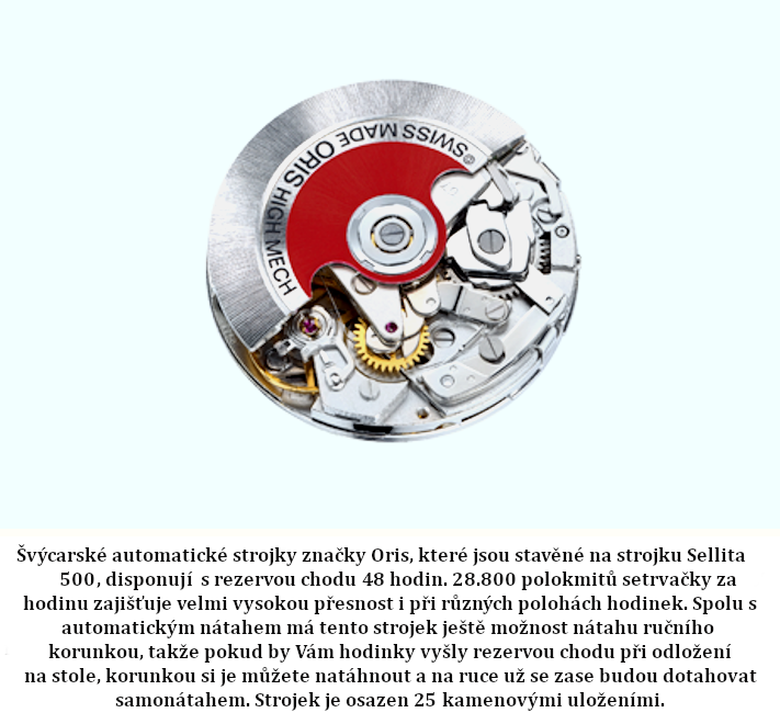 upravovat o cca. 1 cm, to je však plně dostačující pro rychlé úpravy při  změnách obvodu zápěstí - když je teplo (zápěstí nabyde) nebo když se ochladí (zápěstí se zmenší). Tento systém je velice důmyslný a pro majitele hodinek velmi praktický.Švýcarské automatické strojky značky Oris, které jsou stavěné na strojku Sellita 500, disponují s rezervou chodu 48 hodin. 28.800 polokmitů setrvačky za hodinu zajišťuje velmi vysokou přesnost i při různých polohách hodinek. Spolu s automatickým nátahem má tento strojek ještě možnost nátahu ručního korunkou, takže pokud by Vám hodinky vyšly rezervu chodu při odložení na stole, korunkou si je můžete natáhnout a na ruce už se zase budou dotahovat samonátahem. Strojek je osazen 25 kamenovými uloženími.Oris používá pro výrobu skel svých hodinek několik druhů materiálů. Nejtvrdším