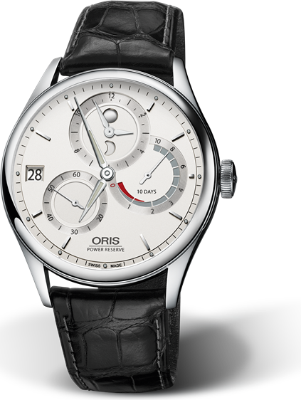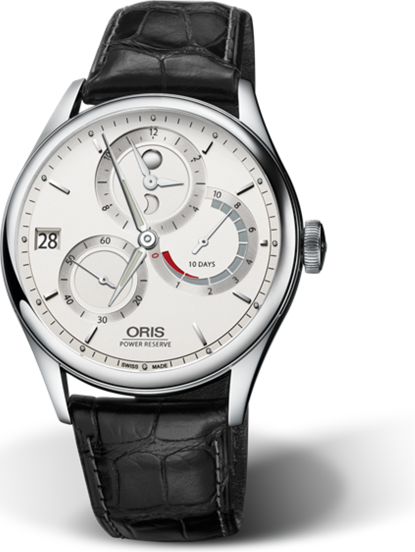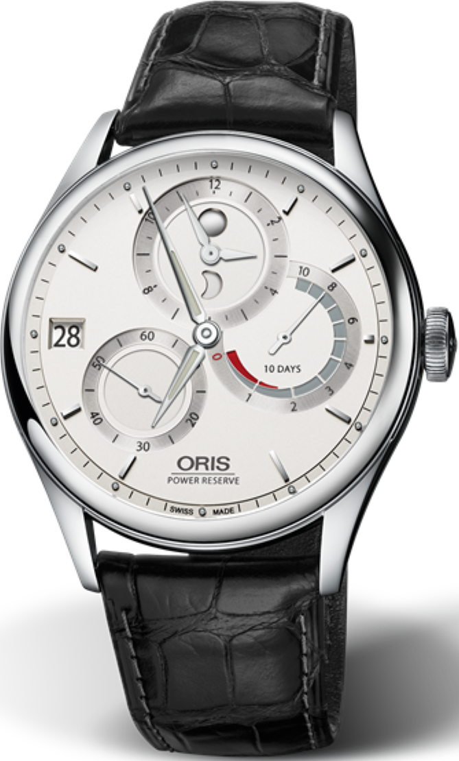 toho je strojek vlastní výroby s úžasnou rezervou chodu 10 dní.  Oris tento svůj strojek osazuje poté různými nástavbami (hodinářskou terminologií