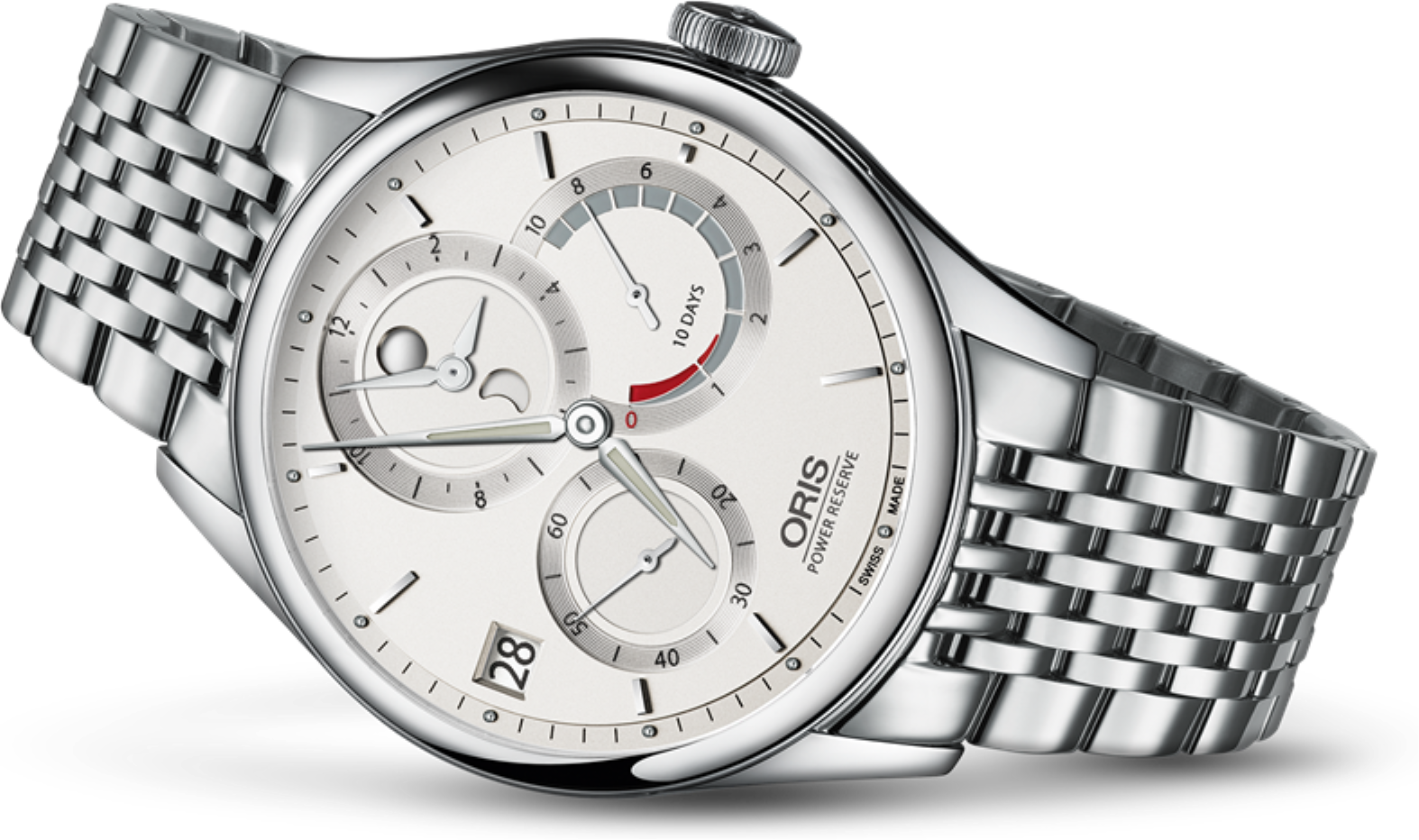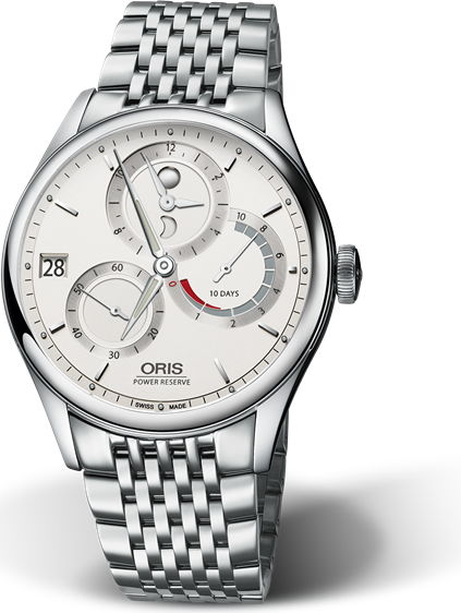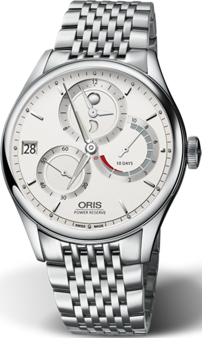 toho je strojek vlastní výroby s úžasnou rezervou chodu 10 dní.  Oris tento svůj strojek osazuje poté různými nástavbami (hodinářskou terminologií